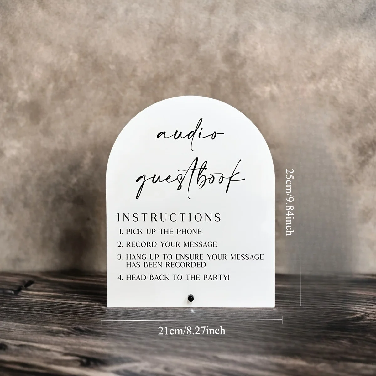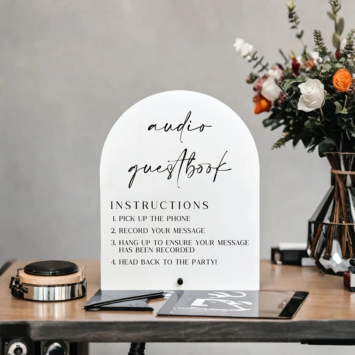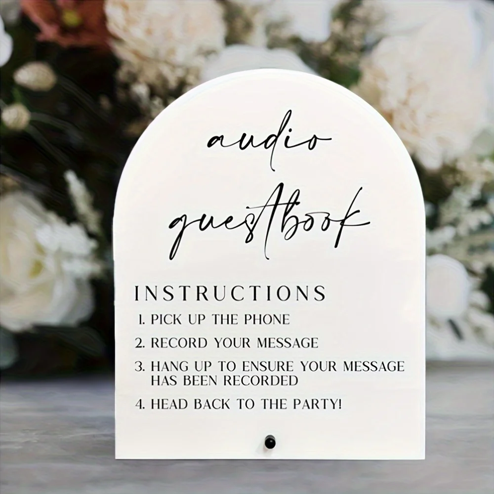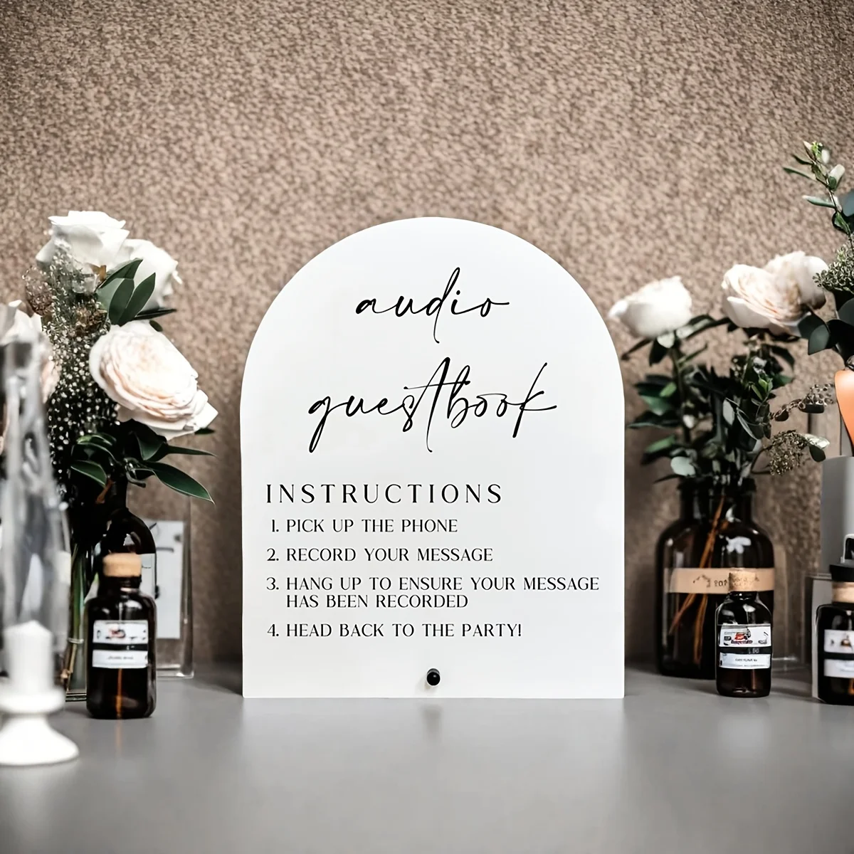 - Features the elegant handwritten “audio guestbook” text and clear black instructions for easy use by guests.
