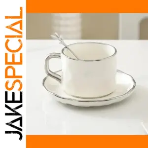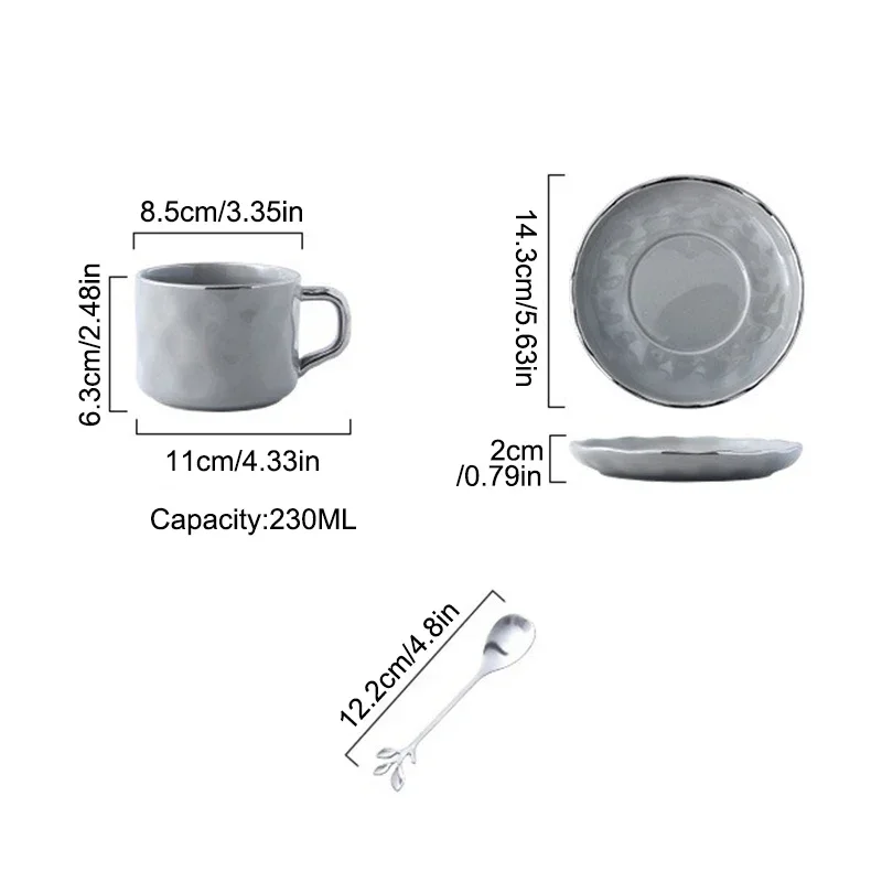 Enhance your coffee or tea moments with this elegant 230ml porcelain ceramic coffee cup and saucer set, featuring a sleek European and American style design. The smooth, glossy white surface is accentuated with a delicate, thin metallic gold rim, adding a luxurious touch. The cup, measuring 8.5 cm in diameter and 6.3 cm in height, comfortably holds 7.7 ounces of your favorite beverage. It pairs perfectly with the 14.3 cm diameter saucer, which has gently scalloped edges, and includes a 12.2 cm metallic spoon with a decorative leaf motif. Crafted from high-quality, heat-resistant, BPA-free porcelain, this eco-friendly set is dishwasher safe, durable, and available in white, dark gray, or light gray—ideal for sophisticated home or commercial use to elevate your serving experience.