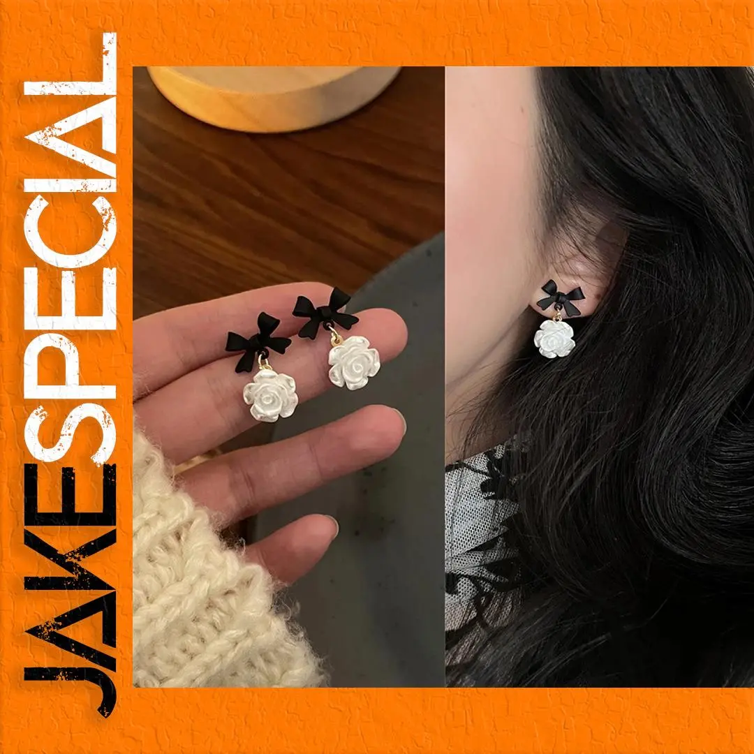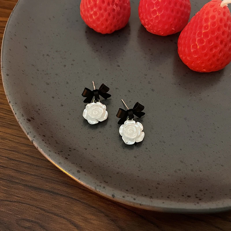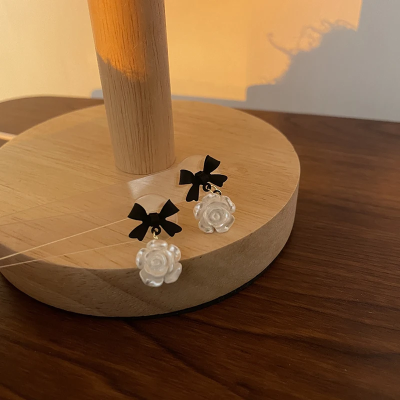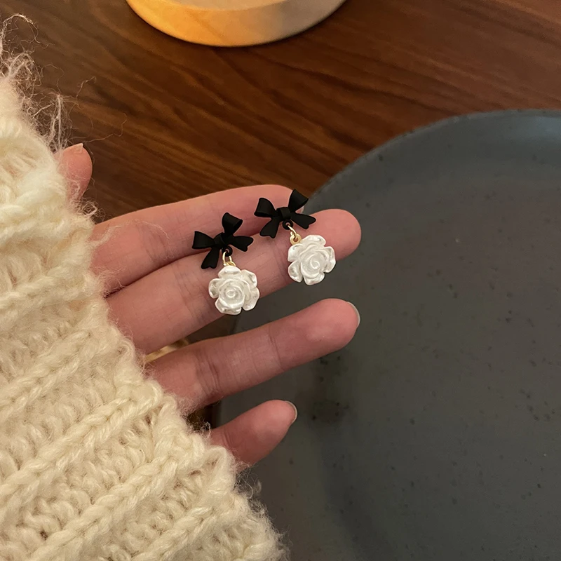 Experience timeless elegance with these charming drop earrings featuring a delicate white camellia flower and a sleek black bow. Crafted with resin and alloy, these earrings beautifully blend a charming floral motif with a sophisticated black or blue metal finish. Their petite size makes them perfect for daytime outings or festive occasions, adding a touch of grace without overwhelming your look. The glossy flower petals and matte bow create a refined contrast, highlighting feminine beauty and style. With excellent craftsmanship and lightweight construction, these earrings promise comfort and durability, empowering you to casually wear them or elevate your party outfits effortlessly. Imagine yourself receiving compliments whenever you wear this enchanting jewelry piece.