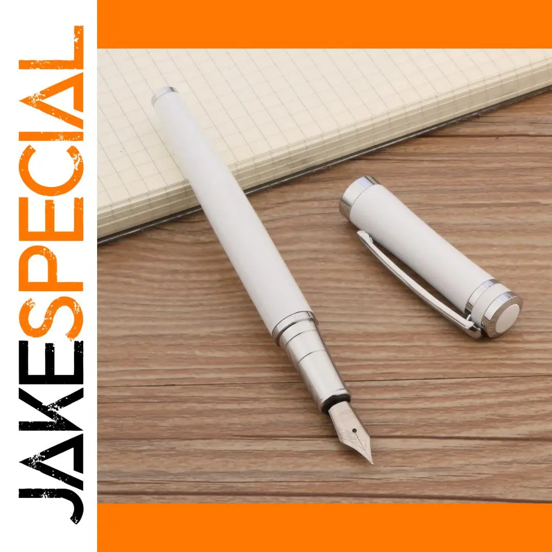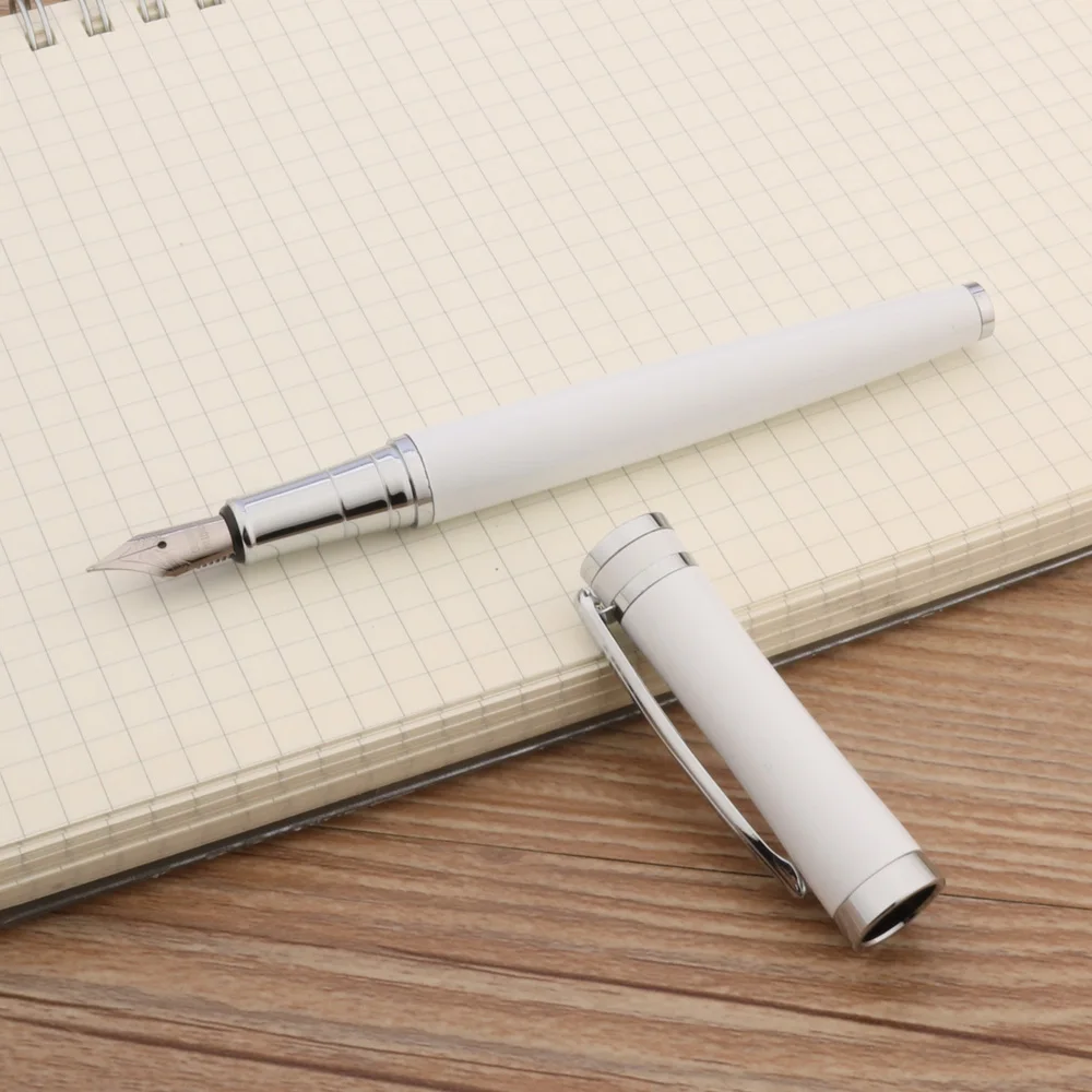 Experience the luxury of this high-quality metal fountain pen, crafted with exquisite attention to detail. The sleek white body contrasts harmoniously with polished metallic silver accents near the tip, end, and clip, creating an understated yet sophisticated look. The stainless steel nib with a fine 0.5mm point is engraved with intricate detailing, ensuring smooth, precise strokes. Its cylindrical cap features a matching silver trim and a polished curved clip, combining functionality with timeless elegance. Ideal for professional, academic, or personal use, this pen embodies craftsmanship and durability. With compatibility for international standard ink cartridges and a convenient squeeze-type converter, it offers effortless refilling. Elevate your writing experience with this premium writing instrument that radiates class and reliability.