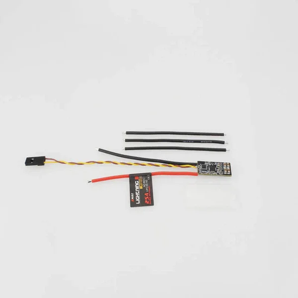 Experience high-performance precision with the EMAX Lightning S 25A ESC, featuring BLHeli S firmware and damped light technology, specifically designed for FPV racing drones. Its compact, lightweight rectangular circuit board, finished in sleek black with metallic solder points and surface-mounted components, ensures reliable operation. Equipped with three insulated wires—red (max 25A), yellow, and black—this ESC supports 2-4S batteries, making it ideal for high-speed drone applications. Suitable for ages 14 and up, and 6-12 years, this durable component is crafted from high-quality composite material, delivering the perfect balance of power, performance, and reliability.