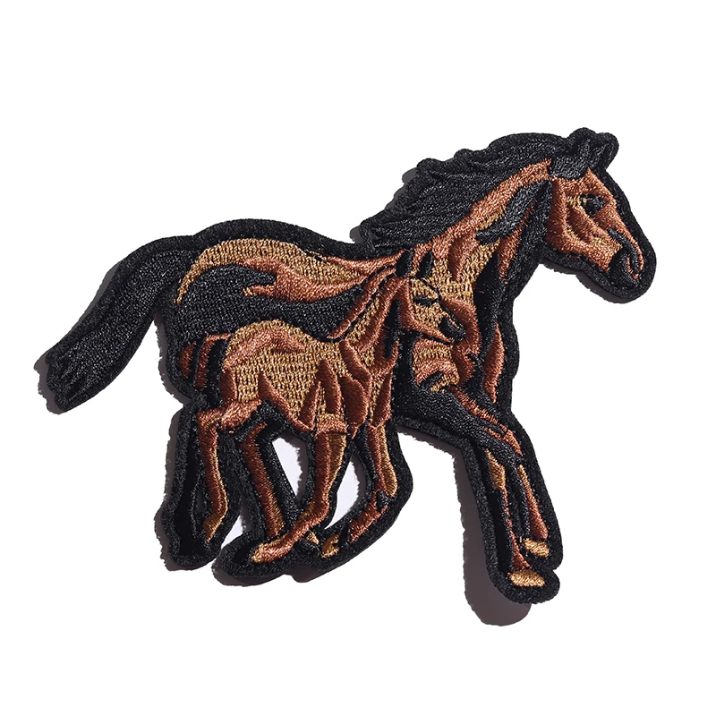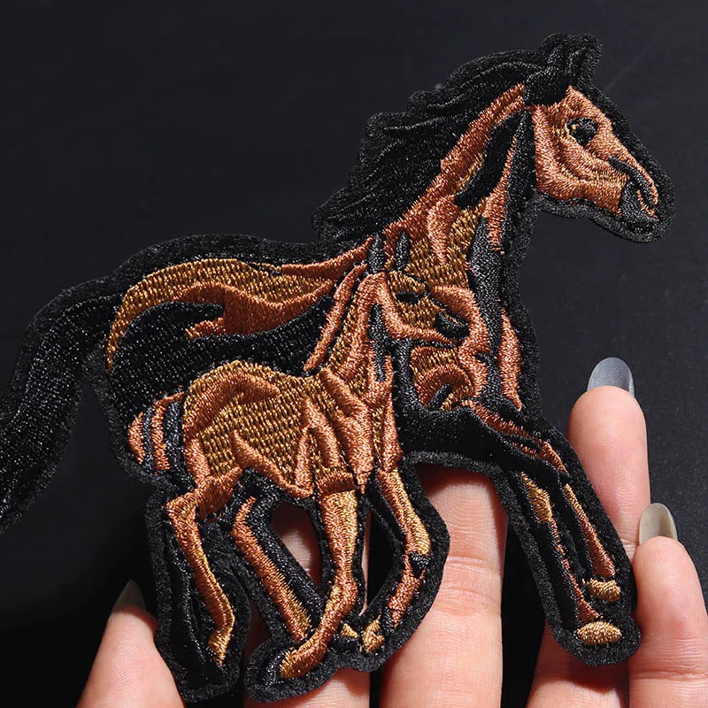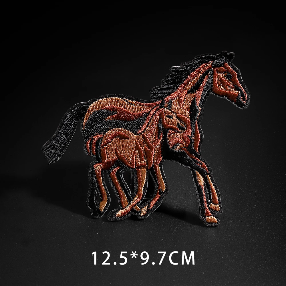 This exquisite iron-on embroidered patch beautifully showcases two majestic horses, measuring approximately 12.5 cm in width and 9.7 cm in height. Crafted from non-woven fabric, this patch displays an incredible level of detail, capturing the horses' distinct musculature and dynamic poses. The intricate stitching highlights various shades of brown and black, complemented by a contrasting black border that adds sophistication. Imagining this patch adorning your clothes, you can instantly elevate your style while showcasing your love for horses. Whether you're dressing up a jacket or personalizing a bag, this patch serves as both an artistic representation and a delightful conversation starter.