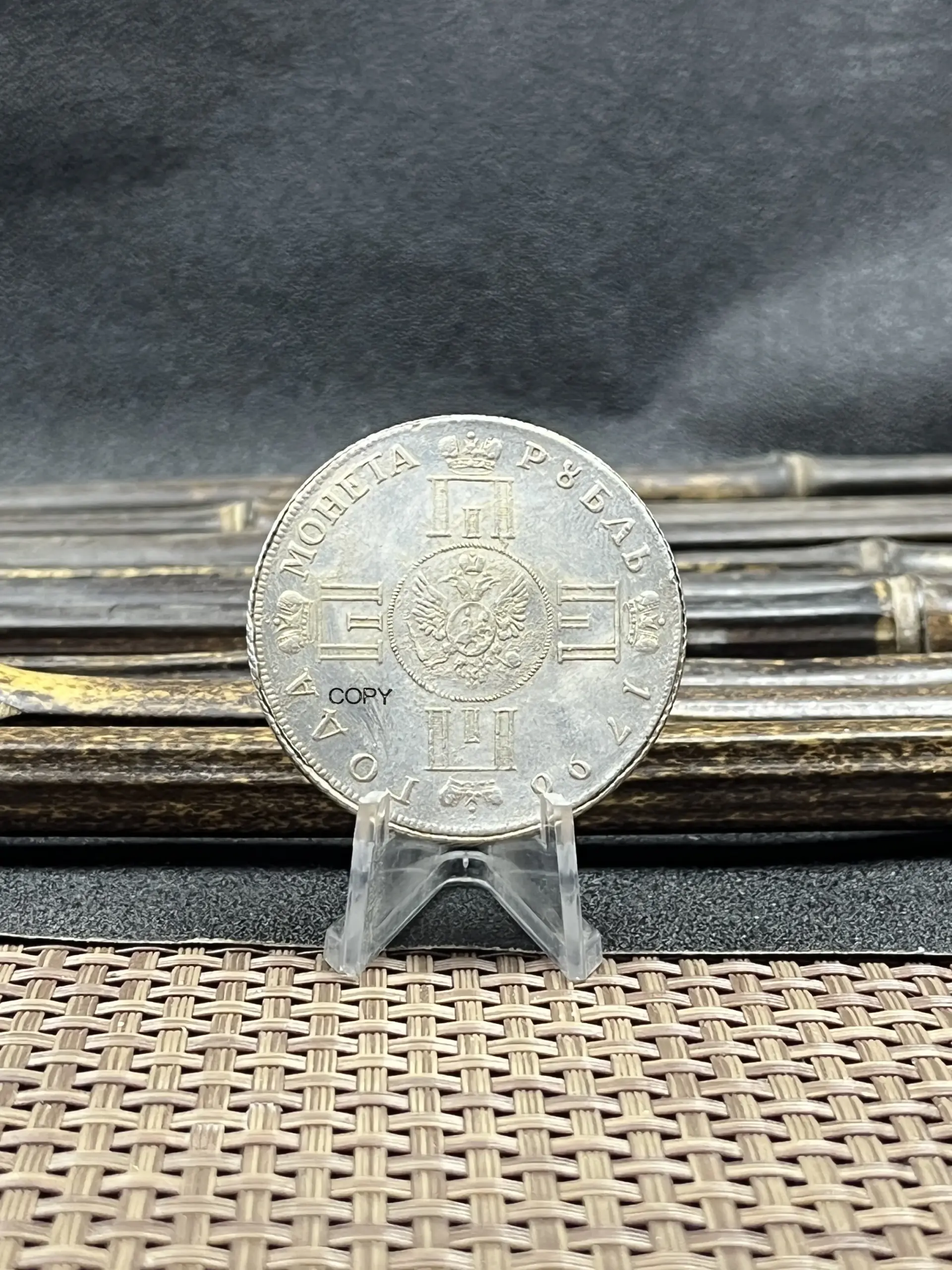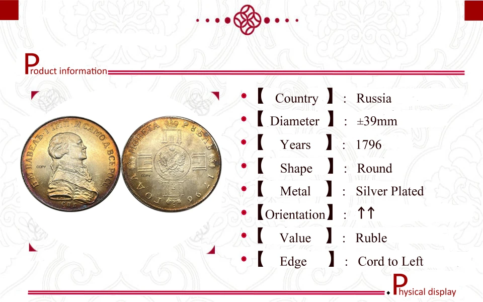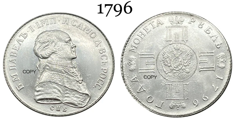 - Coin dimensions are consistent with historical 1796 1 Ruble currency, maintaining authenticity in size and weight, ideal for historical displays or as a decorative artifact.