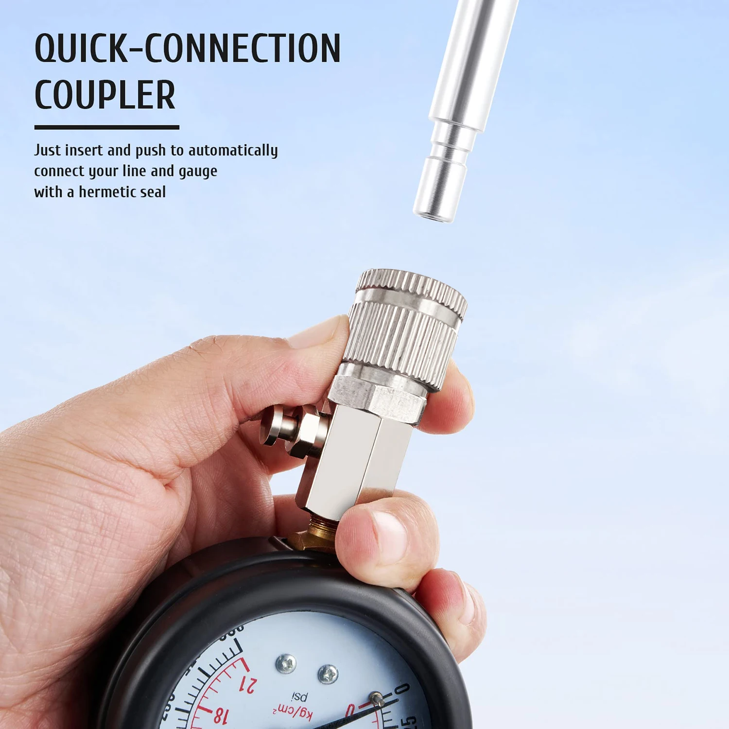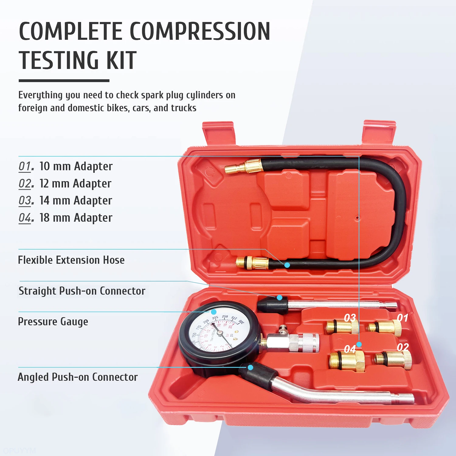 Imagine confidently working on your vehicle, knowing you have the right tools at hand. With this compression test kit, you can detect engine problems early, saving money and time. Its durable build and comprehensive adapter set make every diagnosis reliable and straightforward. Whether you're maintaining a personal car or managing a professional garage, this gauge elevates your mechanical skills. Enhance your engine care routine today—trust in this all-in-one compression meter, and experience the peace of mind that comes with precise, professional results.