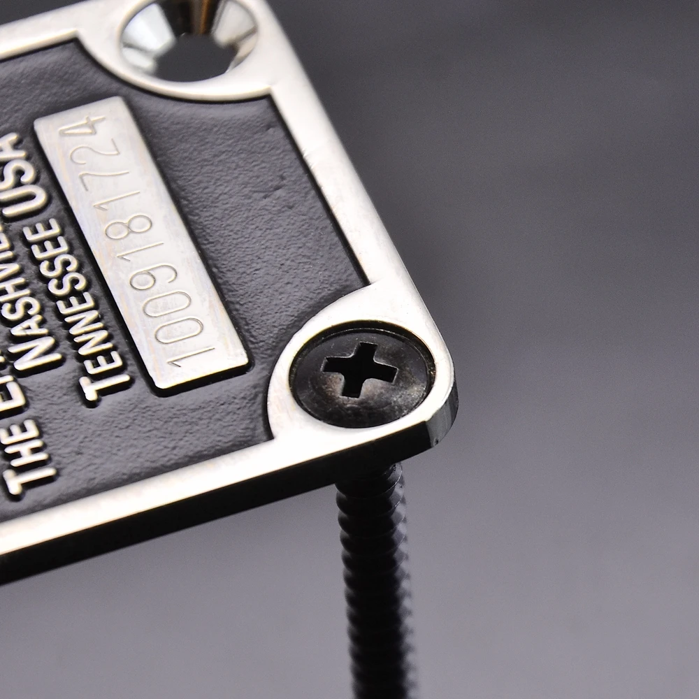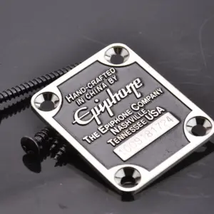 Imagine giving your guitar or bass a fresh, polished look with this expertly crafted neck joint plate. Made in Korea, this replacement part offers a sleek, professional appearance that enhances the instrument’s aesthetic and durability. The rectangular shape features rounded edges, with polished silver borders that reflect light beautifully. The black center area provides a striking contrast, embossed with elegant white lettering indicating “HAND-CRAFTED IN BY Epiphone THE EPIPHONE COMPANY NASHVILLE, TENNESSEE USA,” ensuring authenticity and craftsmanship. Its sturdy construction and precise fit make installation seamless, giving your instrument a renewed, high-quality feel. Whether for repair or upgrade, this part guarantees a perfect blend of style and function, elevating your playing experience.