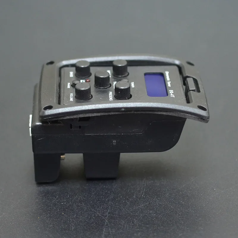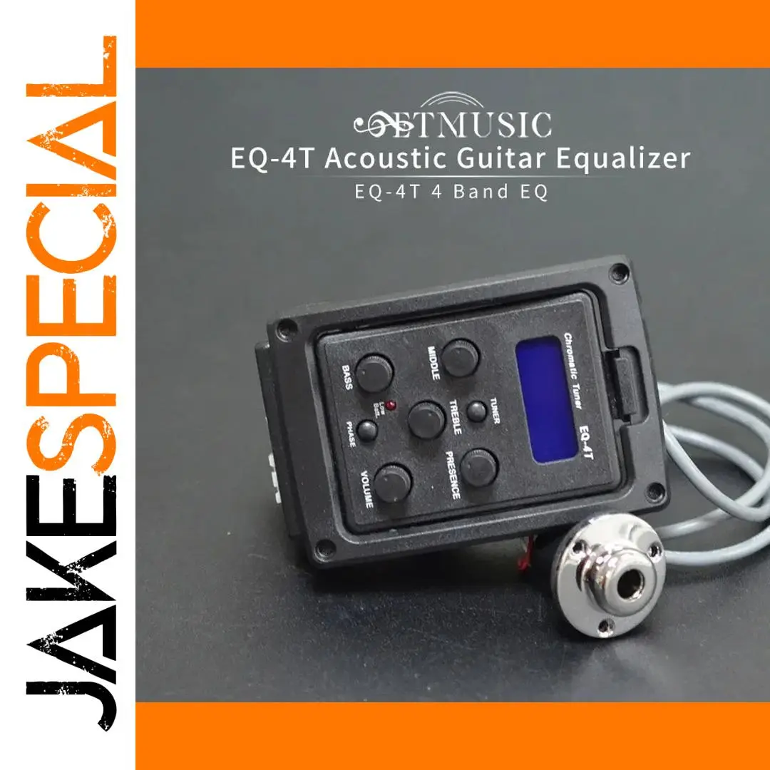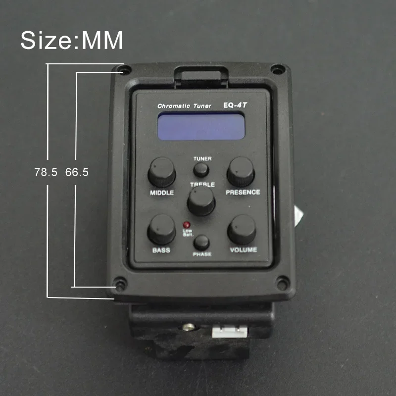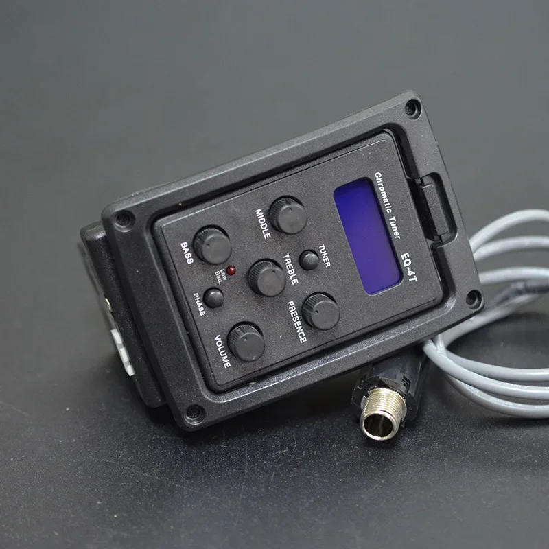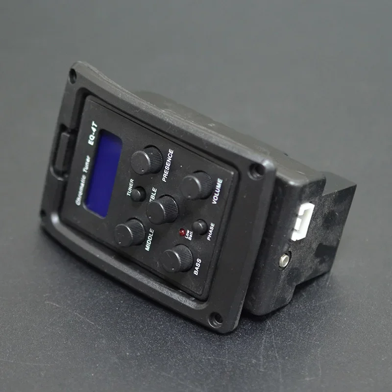 Enhance your acoustic guitar with this sleek EQ-4T 4-band preamp, featuring a built-in pickup and an easy-to-read LCD tuner with auto and manual modes. The compact black design includes controls for bass, middle, treble, and presence, along with a phase effect knob and volume adjustment, enabling you to craft the perfect tone. Powered by a 9V alkaline battery (not included), it connects via a 6.35mm output jack and is suitable for installation inside standard acoustic guitars. Crafted for professional amplification and tonal control, this high-quality preamp ensures your guitar sounds its best during live performances or practice sessions.