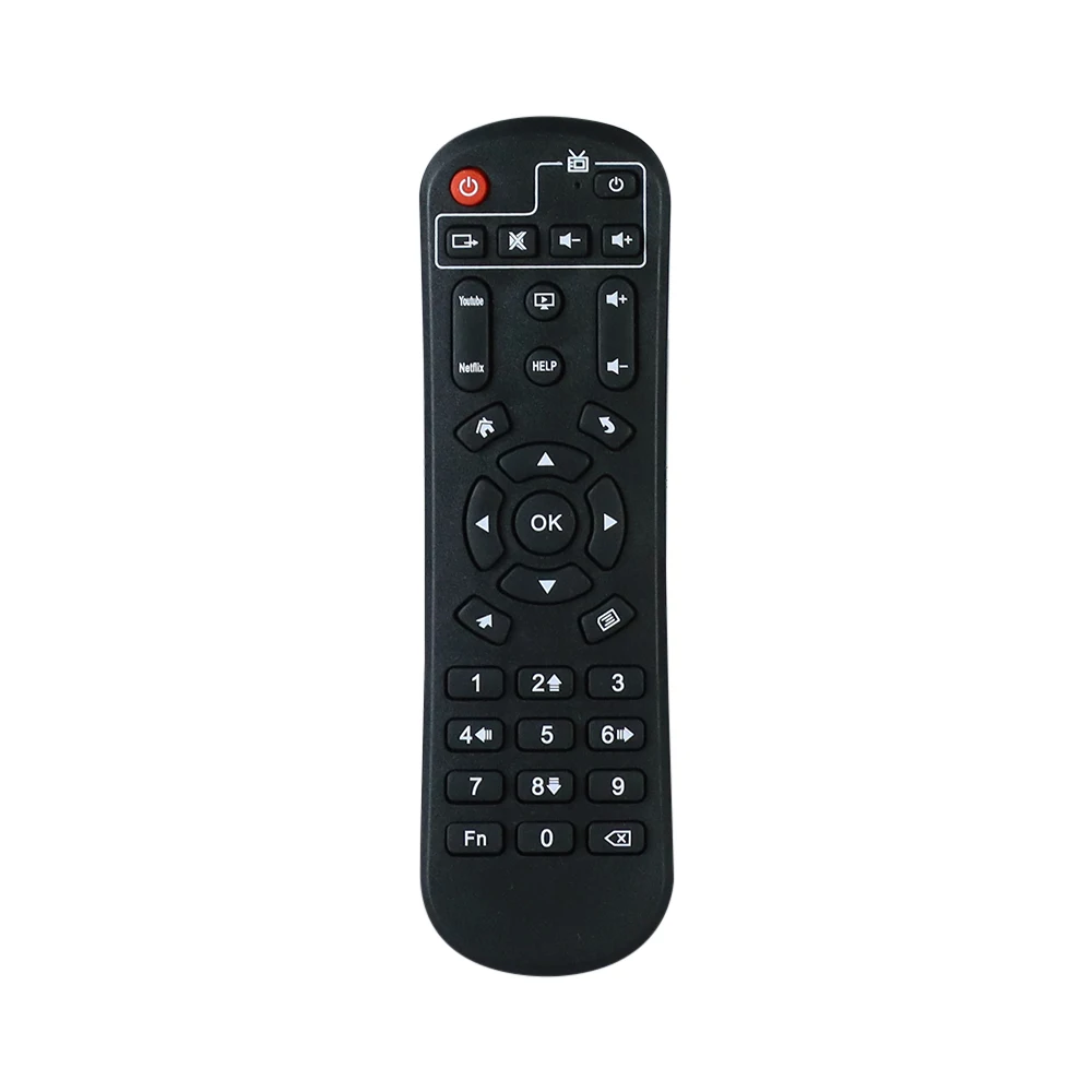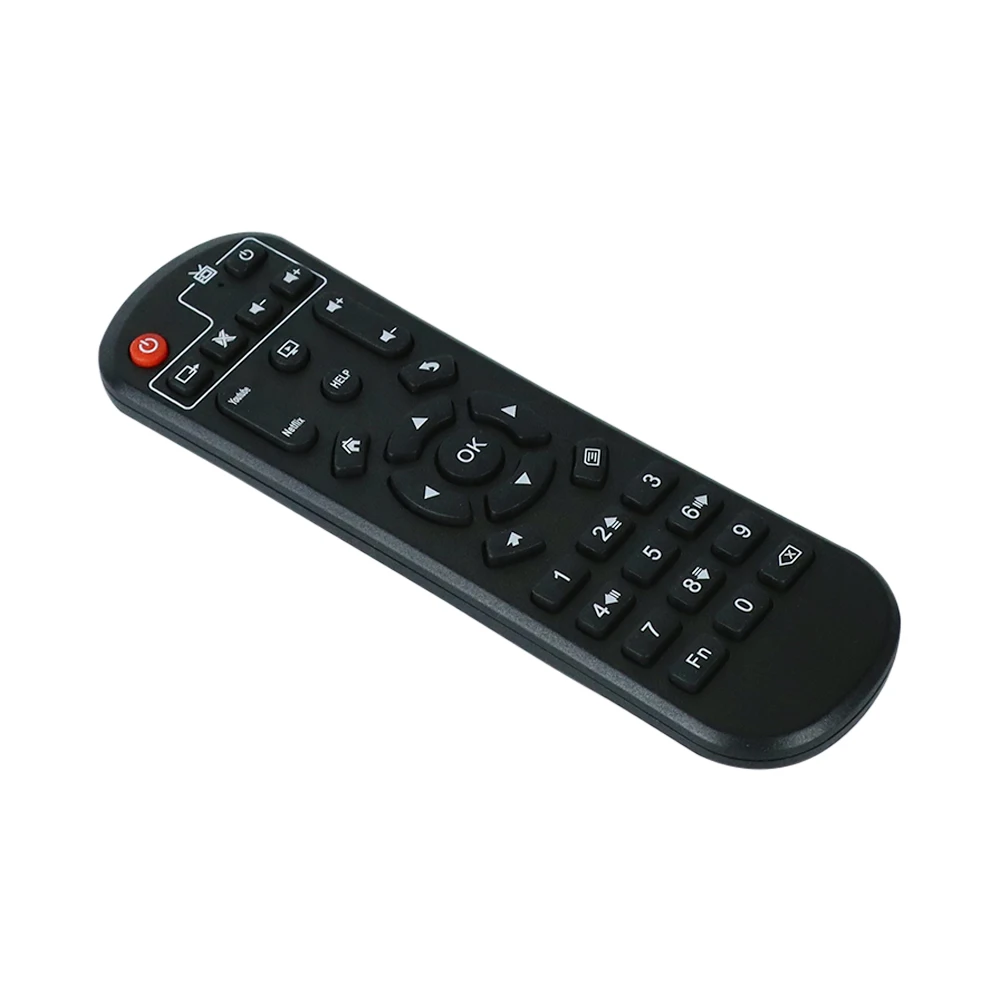 Experience seamless control with this black remote designed for versatile TV boxes, including models like A95X, X88pro10, F4, F3, AIR, H60, H40, H50, 6K, and X88 PRO 20. Its ergonomic, slightly curved shape ensures comfortable handling, while the matte black surface reduces glare and smudges for a sleek look. The remote features a prominent red power button at the top right, a central circular directional pad with arrow keys and an “OK” button, and dedicated function buttons such as “Home,” “Help,” volume controls (+ and -), and media playback controls. With infrared (IR) wireless communication on a single channel, it offers reliable and user-friendly operation.