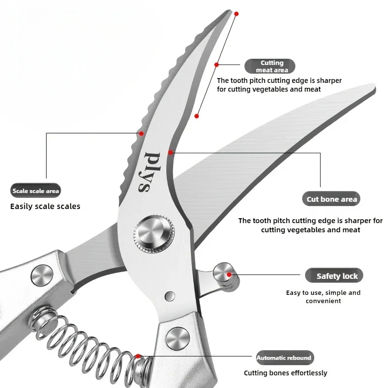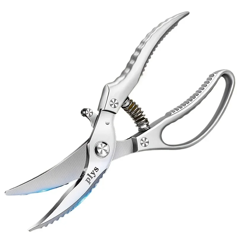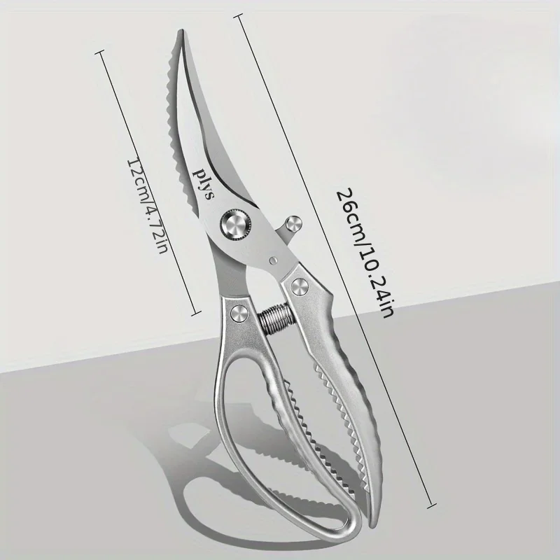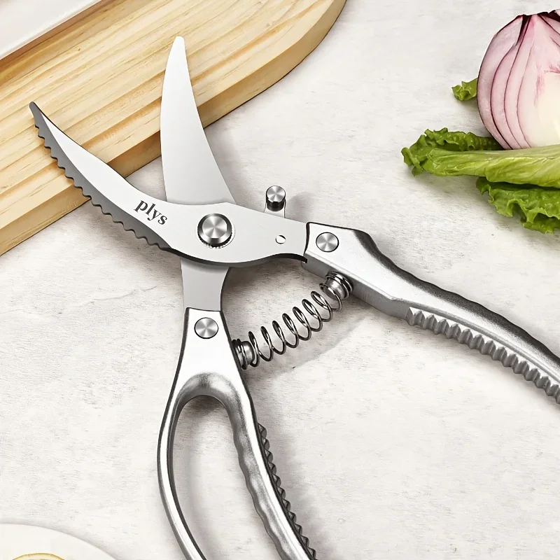 The Kitchen Scissors by PLYs are made from high-quality stainless steel, featuring sharp, durable blades that resist rust. Designed with an ergonomic handle for a comfortable grip, they minimize hand fatigue during prolonged use. The built-in spring mechanism allows for effortless reopening after each cut, making them ideal for cutting chicken bones, fish bones, vegetables, and meats. With a sleek metallic gray finish, these multi-purpose scissors combine modern aesthetics with practical functionality. Their simple structure ensures easy cleaning and hygiene, meeting food safety standards.