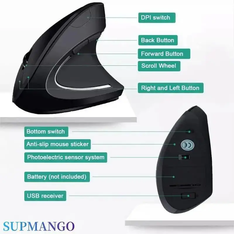 Experience enhanced comfort with this ergonomic vertical wireless mouse, featuring a sleek upright design that minimizes wrist strain and muscle tension. Equipped with a high-precision Pixart 3095 sensor supporting up to 3500 DPI, it offers smooth, accurate tracking at speeds up to 60 IPS with 20G acceleration. The mouse includes 6 buttons—forward, back, DPI adjustment (800/1200/1600 DPI), and a 3D textured scroll wheel—allowing customizable control. Powered by two AA batteries (not included), it connects wirelessly via a 2.4GHz USB nano receiver with a 10-meter range. Measuring approximately 4.80″ and weighing 105 grams, this mouse is compatible with Windows systems, combining ergonomic design and advanced tech for a comfortable computing experience.