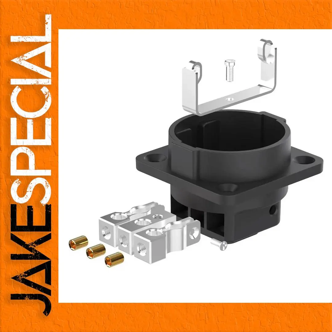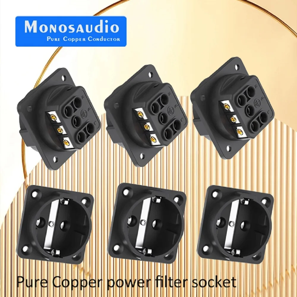 Step into a world of reliable electrical connections with this this ES3R pure copper power outlet socket. Crafted from high-rigidity nylon with 50% glass filler, its sleek black, circular design is both modern and durable. The square flange with rounded edges and four mounting holes provides a clean, structured look, perfect for professional environments. Situated above the socket, a polished metallic bracket adds an industrial touch, combining functionality with aesthetic appeal. The internal components, including four layered plating with oxygen-free copper, silver, palladium, and rhodium, guarantee excellent conductivity and corrosion resistance. With precise hex screw connections and robust terminal blocks, this outlet ensures secure wiring. Its compact dimensions (51mm x 51mm x 36mm) make it versatile for various installations, delivering top-tier performance and reliability.