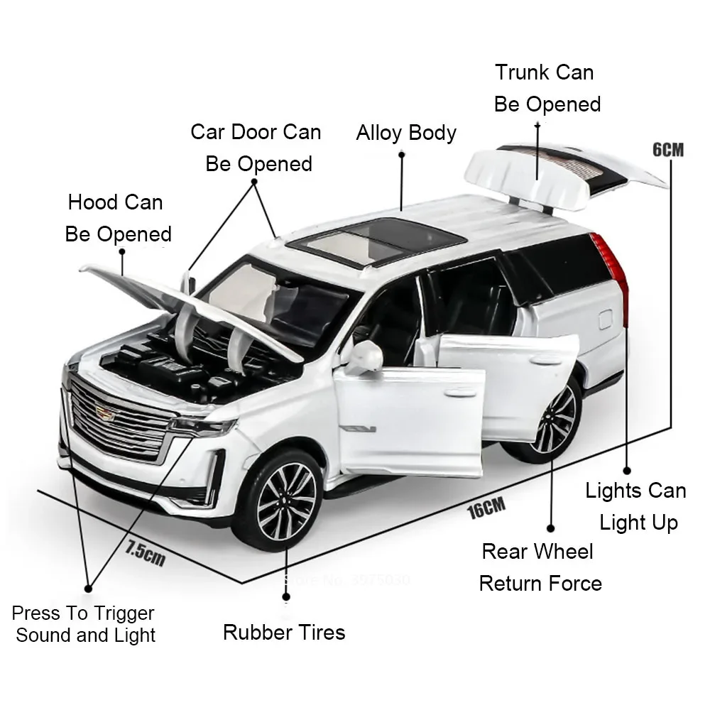 Experience the luxury and sophistication of this meticulously crafted 1:32 scale diecast toy car that captures the essence of the real Escalade GLS580. Finished in a glossy white, this model boasts sleek, modern lines and precise detailing, from the prominent front grille with horizontal slats to the elongated, stylish headlights. The black-tinted windows create a striking contrast with the body, emphasizing its upscale appearance. Featuring six opening doors, textured rubber tires on black and silver multi-spoke rims, and molded features like side trims and roof rails, this model offers an authentic and refined look. Its durable zinc metal body and plastic chassis ensure longevity, while light and sound effects, along with a pull-back function, enhance play and display value. Perfect for collectors or car enthusiasts, this model brings a touch of elegance to any collection.