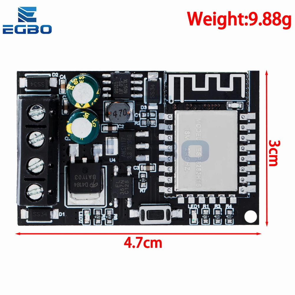 Experience seamless wireless control with this sleek ESP-12F WiFi module. Designed for smart home automation and remote management, this compact device features a black matte PCB surface with a clearly visible green electrolytic capacitor and a shiny metallic WiFi module. Its organized surface-mount components reflect precise engineering and modern aesthetics, making it both functional and stylish. The module’s rectangular shape and minimal design facilitate easy integration into various projects, whether for home automation, computer control, or custom electronics. With a voltage range of 5V to 36V, it offers versatility and robust performance, ensuring you can rely on it for your most demanding applications. Imagine effortlessly managing your devices remotely, thanks to this reliable, visually appealing module.