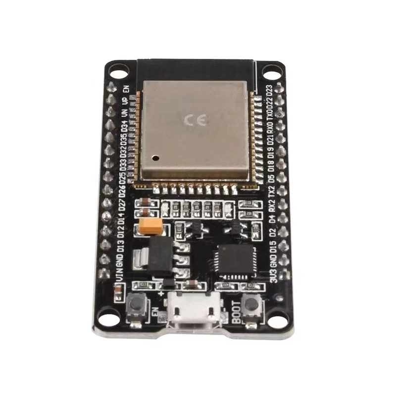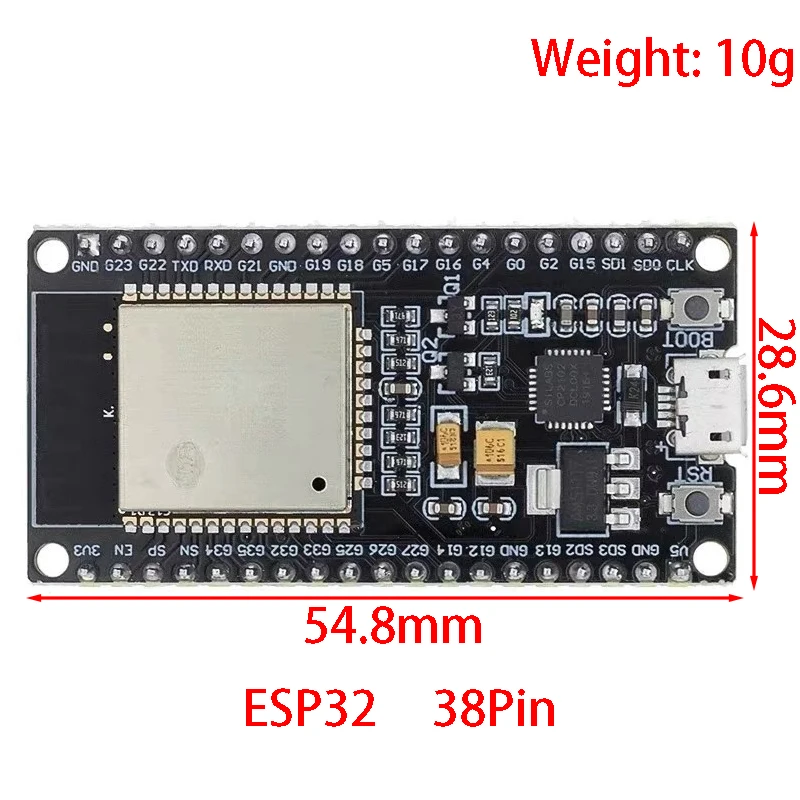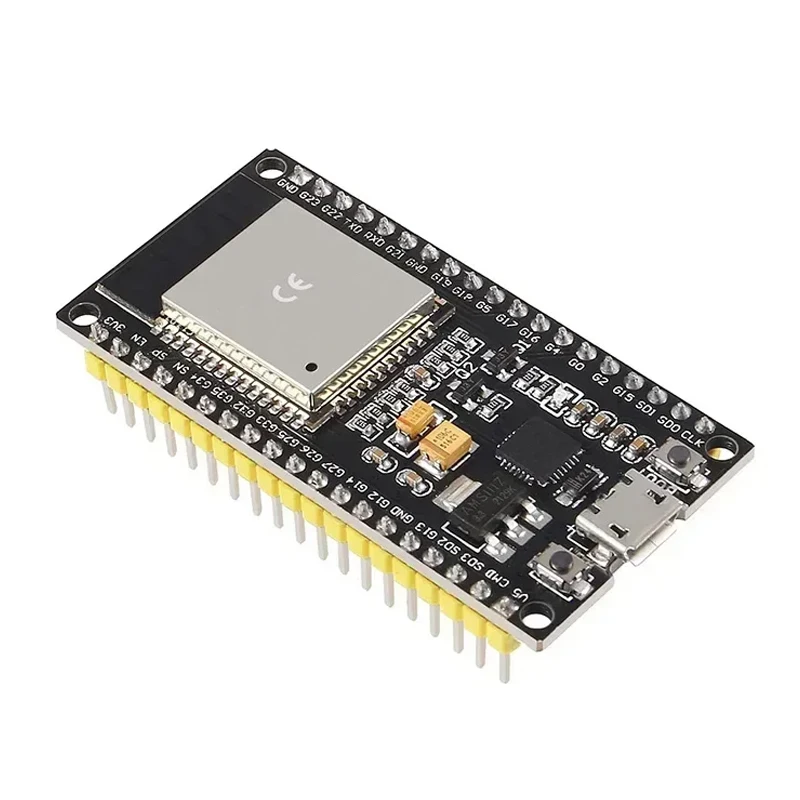 The ESP-32 Development Board features a sleek black PCB with a central silver-colored metal shield housing the ESP32 microcontroller with the 2102 chip, dual-core CPU, and embedded Wi-Fi (2.4 GHz) and Bluetooth dual-mode capabilities. Available in 30-pin or 38-pin configurations, it includes an antenna switch, RF balun, power amplifier, low noise amplifier, filters, and power management modules, all designed to occupy minimal space for compact IoT applications. Small white push buttons, clearly marked pinouts, and organized surface-mounted components highlight its modern, technical aesthetic, making it an ideal choice for versatile, low-power development projects.