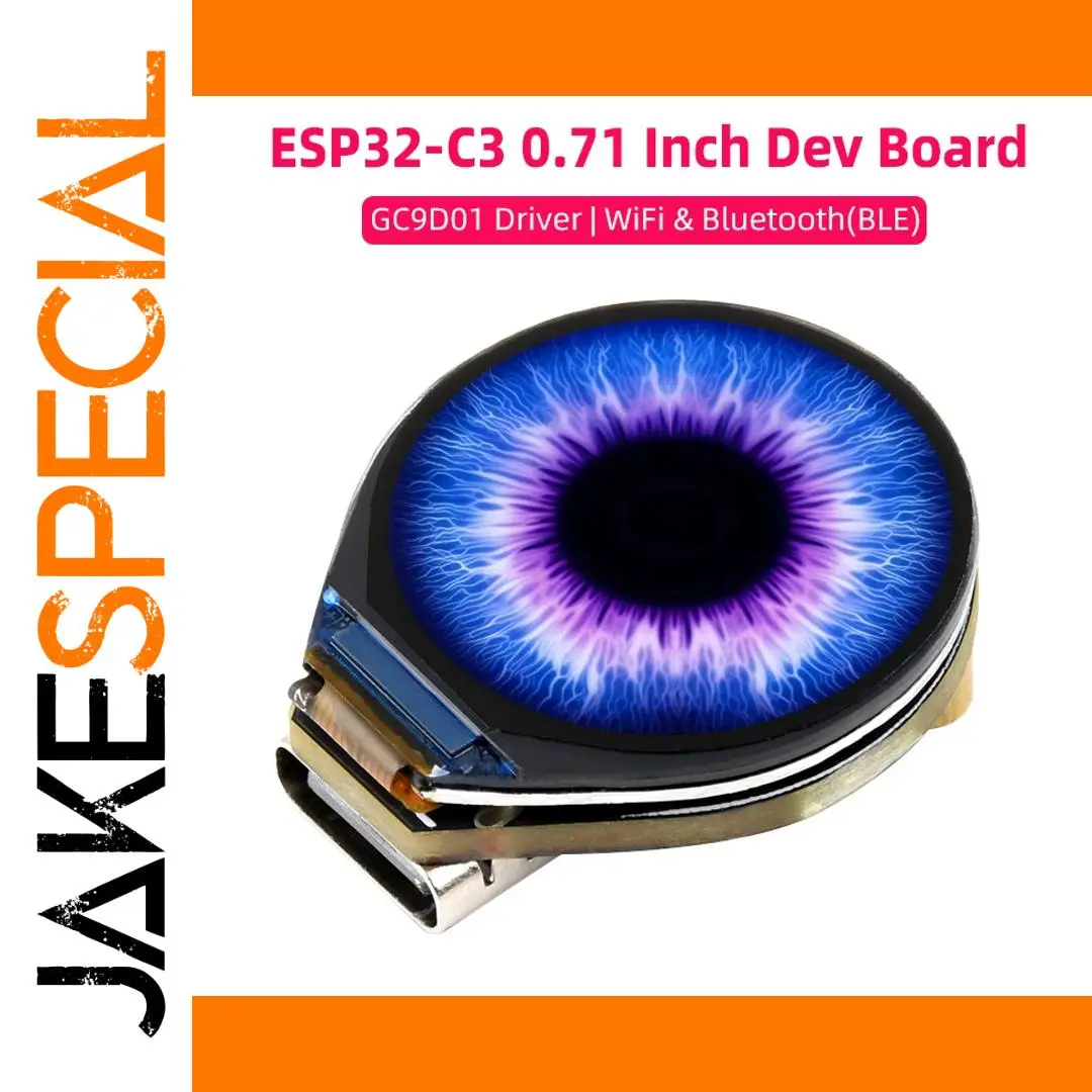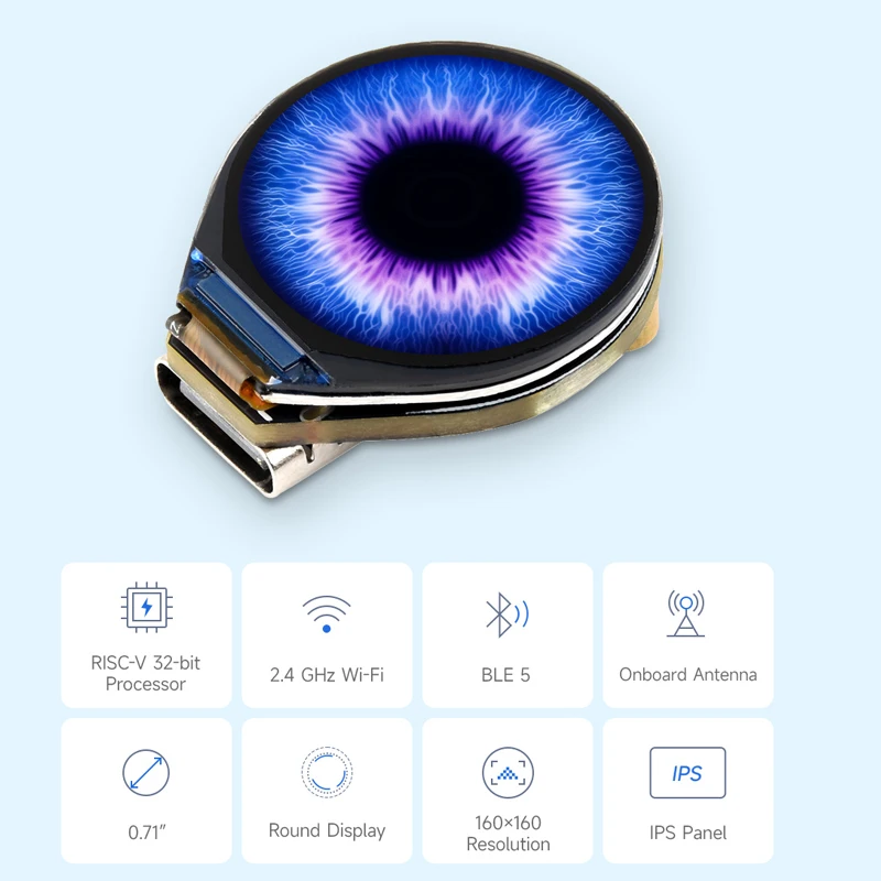 Experience compact high-tech with this ESP32-C3 0.71-inch round display development board, featuring a vibrant 160×160 IPS LCD screen with 350cd/m² brightness. Powered by the low-power RISC-V 32-bit ESP32-C3FH4 processor running up to 160MHz, it offers 400KB SRAM, 384KB ROM, and 4MB onboard flash memory for versatile applications. Equipped with 2.4GHz Wi-Fi (802.11 b/g/n), Bluetooth 5 (LE), and a 4-wire SPI interface with GC9D01 driver, it supports low-power operation ideal for human-machine interfaces like AI-emulation eyes and smartwatches. The compact dimensions (20.12×22.3×1.81mm) include GPIO expansion pads, reset and boot buttons, and a USB Type-C port for seamless power and data transfer. Available with or without a protective case.