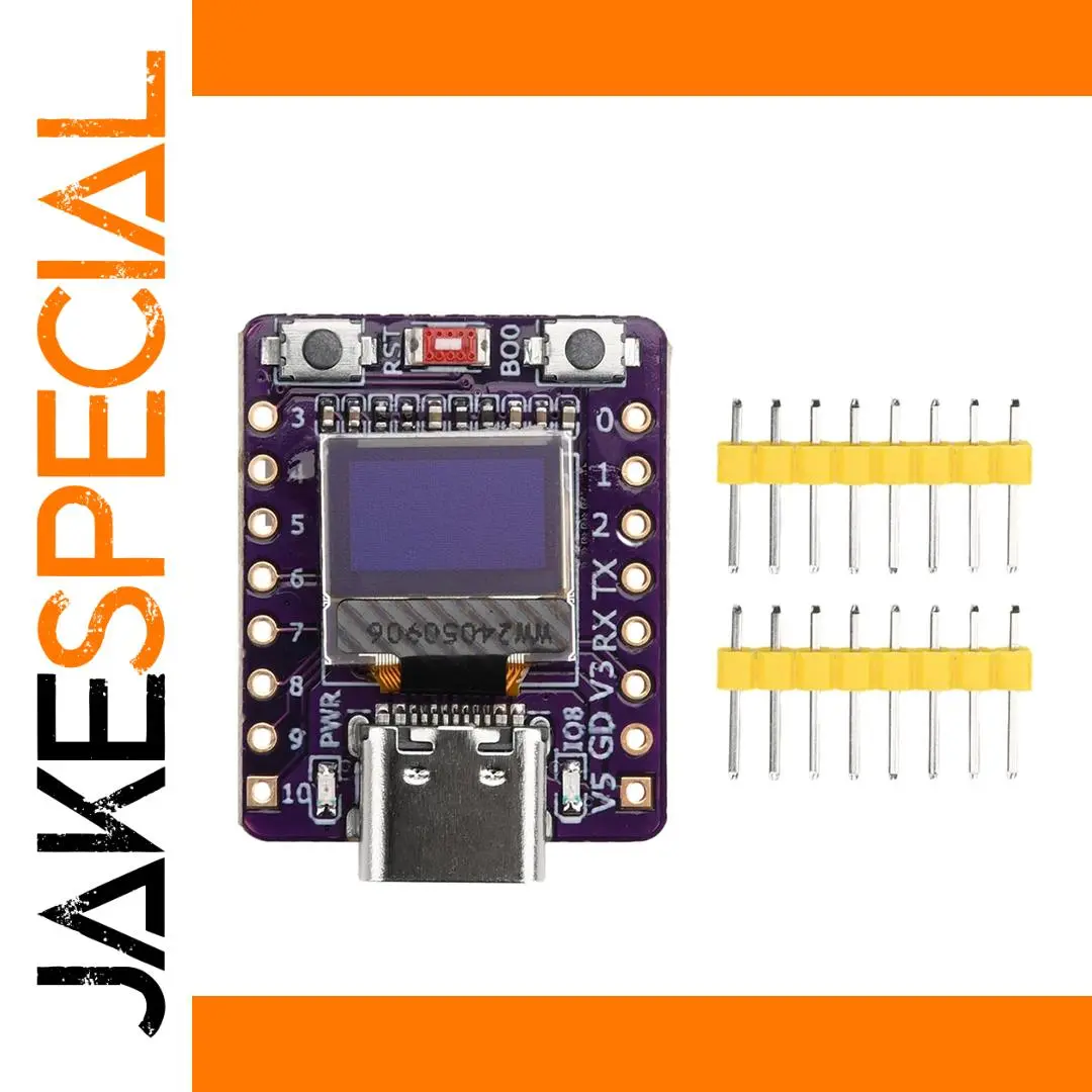 Discover a compact and versatile development board designed for efficient IoT and smart device projects. Featuring a sleek purple PCB, this board combines style with function. Its 0.42-inch OLED display provides clear visual feedback, perfect for debugging or user interfaces. The small rectangular design measures just 24.8mm by 20.45mm, making it ideal for space-constrained applications. An onboard ceramic antenna ensures reliable wireless connectivity, while the Type-C USB interface simplifies power and data transfer. The reset operation is made easy with dedicated reset and start buttons, and the bright blue onboard LED offers instant status indication. Bright yellow pin headers blend visually with the purple PCB, adding a splash of color and making connections straightforward. This board is perfect for developing IoT devices, with rich peripherals and low power features for battery-powered applications.