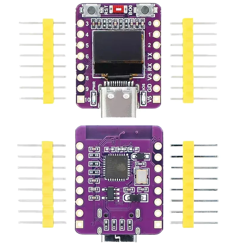Experience the power of connectivity with this sleek, compact ESP32-C3 OLED development board. Featuring a vibrant purple PCB, it combines modern style with practical functionality. The 0.42-inch OLED display offers crisp black and white visuals, perfect for real-time data and system monitoring. Bright yellow pin headers on either side provide easy access for interfacing with other components. Its small size makes it ideal for portable projects, incorporating Wi-Fi and Bluetooth for seamless wireless communication. Whether you're developing IoT devices, prototypes, or custom applications, this board's minimalist design and high performance ensure user-friendly integration and reliable operation. Feel the confidence of working with a high-quality, customizable module that elevates your electronic projects with style and efficiency.