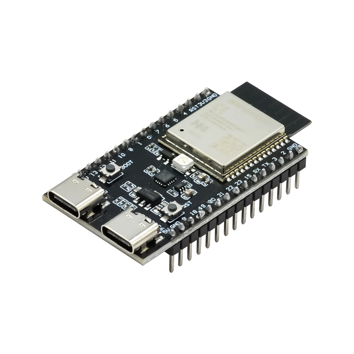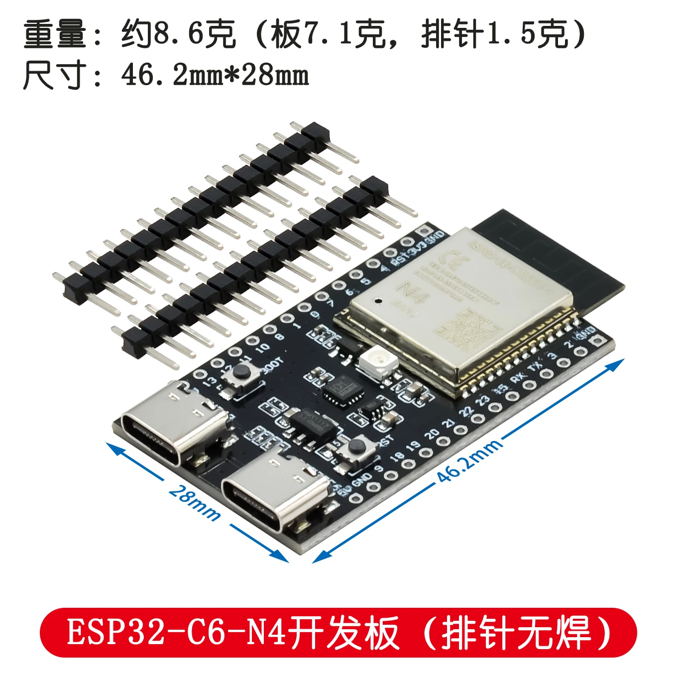 Elevate your IoT projects with this versatile ESP32-C6 development module, available in N4, N8, and N16 variants, with welded and non-welded options. Featuring advanced WiFi 6, Bluetooth, and Zigbee connectivity, this compact black circuit board showcases a sleek design with a prominent silver metal module at its center, providing robust wireless capabilities. Equipped with dual USB-C ports, surface-mounted components, and easily attachable pin headers, it offers flexible integration for prototyping and development. Perfect for creating seamless connected devices, this new module combines modern functionality with a professional, minimalist aesthetic, empowering you to bring innovative ideas to life with confidence.