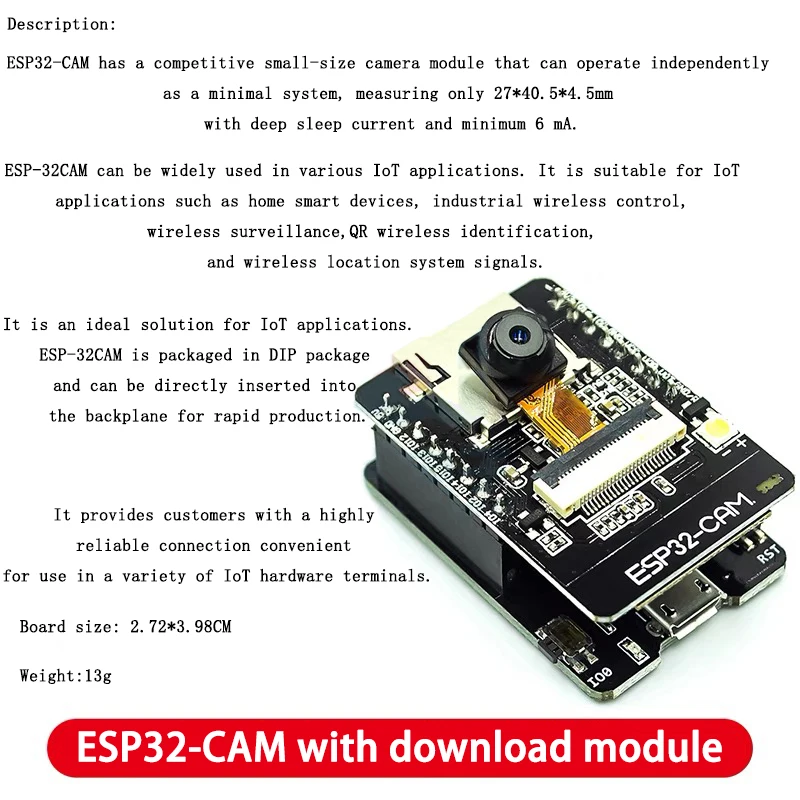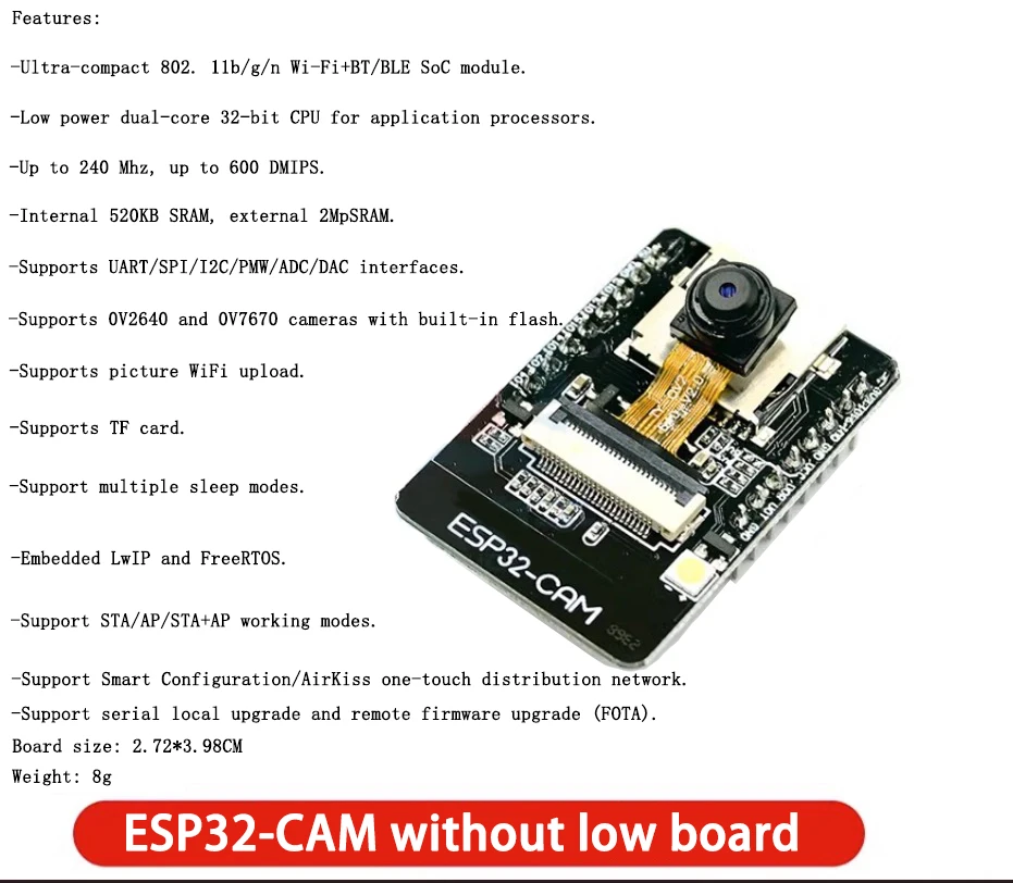 Experience the versatility of the ESP32 CAM development board, featuring a sleek matte black design and a compact layout, ideal for WiFi and Bluetooth-enabled imaging projects. This customizable module supports OV3660 camera options, with a small square camera module mounted near the top center connected via flexible gold-colored ribbon cables. The board includes various configurations such as CAM veneer, without lowers, or with module, making it suitable for a range of applications. Designed for environmental friendliness and standard operation across typical temperature ranges, this powerful development board combines technical sophistication with an unobtrusive aesthetic, perfect for advancing your innovative projects.