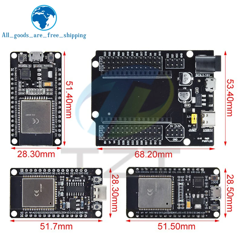This compact ESP32-DevKitC-32 development board measures 52×28mm and weighs approximately 9.5g, featuring a dual-core 32-bit ESP32-DOWDQ5-V3 MCU with built-in WiFi and Bluetooth. It includes 520KB SRAM, 448KB ROM, and a 4MB external storage chip, supporting power input from 5-12V VIN, USB, or external 3.3V supply. Equipped with CH340C USB driver for stable, high-speed downloads, it supports IDE, MicroPython, and other programming environments. Its sleek, organized design combines functionality with a modern high-tech aesthetic, embodying versatility and reliability for various embedded projects.