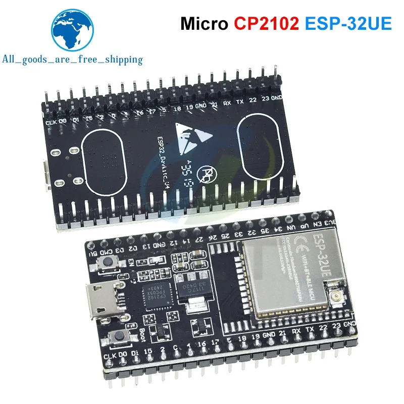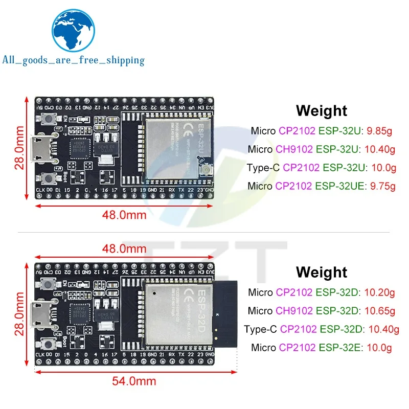 - Supports different ESP32 modules including WROOM-32, WROOM-32D, WROOM-32U, SOLO-1, WROVER, and WROVER-B, for versatile application needs.