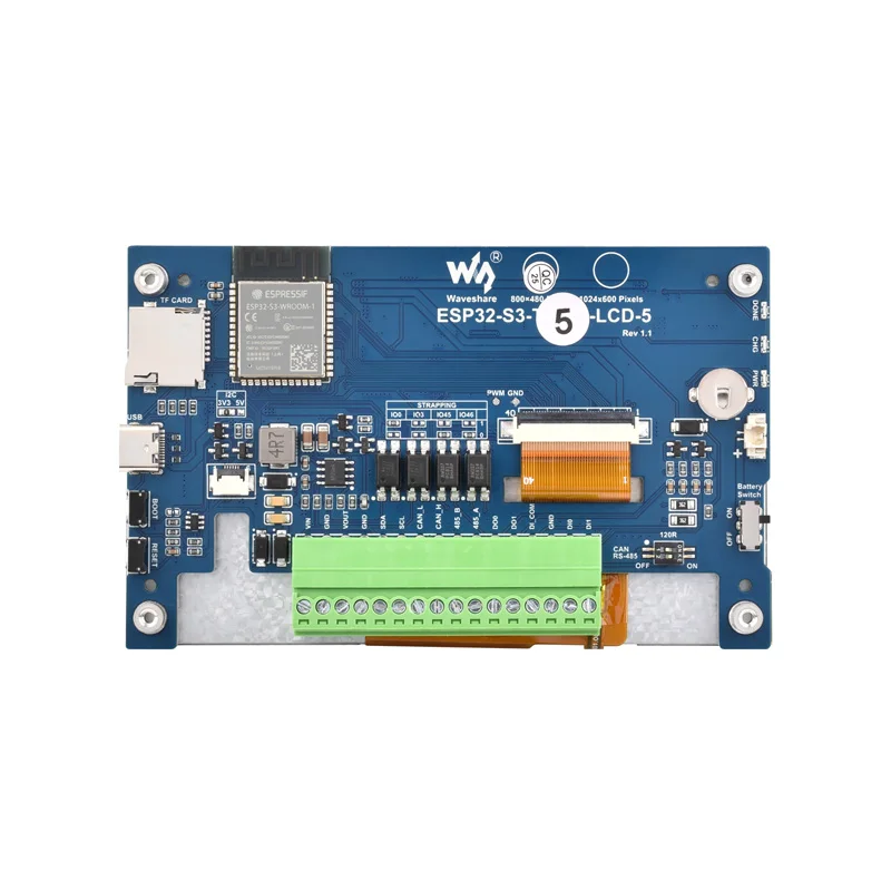Experience seamless integration with this this ESP32-S3 5-inch Touch Screen development board, designed to elevate your projects. Featuring a vibrant 5-inch LCD display supporting resolutions of 800×480 or 1024×600 pixels with vivid 65K colors, it offers a sleek black bezel and a capacitive 5-point touch interface for intuitive control. Powered by an Xtensa 32-bit LX7 dual-core processor reaching up to 240MHz, it handles complex GUI applications smoothly. Equipped with 512KB SRAM, 384KB ROM, 16MB onboard Flash, and 8MB PSRAM, plus WiFi and Bluetooth 5 support, this board ensures robust connectivity. Its comprehensive peripheral interfaces include CAN, RS485, I2C, and a TF card slot, making it ideal for customizable user interfaces and IoT solutions. Whether used for automation, smart devices, or innovative HMI designs, this electronics gem delivers both style and performance.