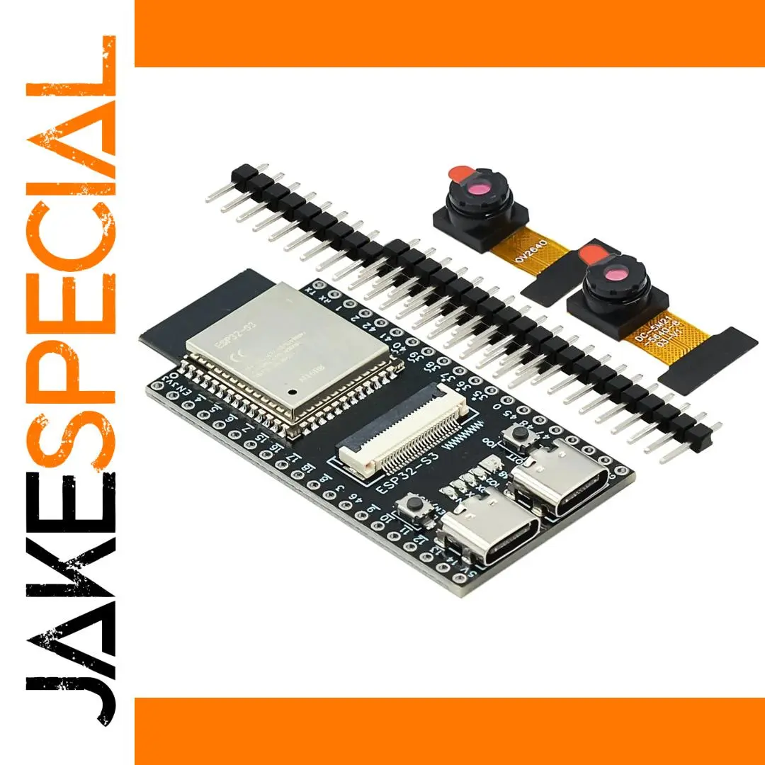 Experience the seamless blend of functionality and modern design with the this ESP32-S3 development board. Its compact, black matte PCB features clear white labels, emphasizing clarity and technical precision. Equipped with dual USB-C ports, it offers a symmetrical and contemporary look that complements its advanced capabilities. The board includes multiple pin headers and a socket, providing extensive connectivity options for peripherals and sensors. The integrated WiFi and Bluetooth modules ensure reliable wireless communication, while optional camera interfaces support OV2640 and OV5640 modules. Vibrant orange ribbons with gold contacts connect the camera modules, adding a splash of color to the professional, high-tech aesthetic. Ideal for innovative projects requiring reliable connectivity and camera functionalities, this development board is perfect for developers seeking a sleek and versatile platform.
