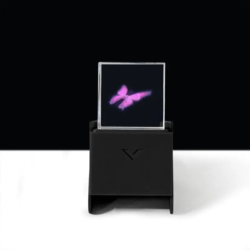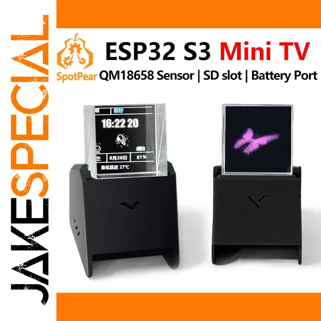 Discover the innovative design of this ESP32 S3-compatible mini TV featuring a 1.3-inch holographic display. Crafted with a sleek, black rectangular base with a matte finish, it exudes modern simplicity and elegance. The compact size makes it perfect for DIY enthusiasts eager to explore holographic tech and smart displays. The standout feature is its small, square LCD screen mounted vertically, showcasing sharp monochrome digital data on one side and vivid, animated colorful visuals like a glowing butterfly on the other. Complemented by a transparent refractive prism, this device offers a stunning futuristic aesthetic that enhances visual depth and clarity, ideal for interactive projects, electronic art, or personal digital dashboards.