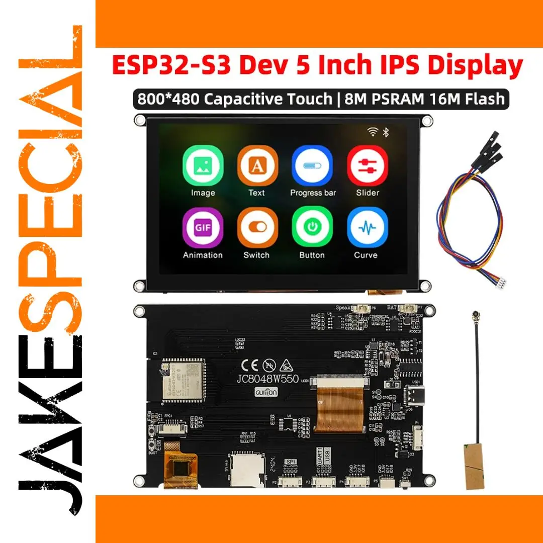 Experience the perfect blend of sharp visuals and advanced connectivity with this this ESP32S3 5 Inch IPS Touch Display Kit. Its vibrant 800×480 resolution and 65K RGB colors bring your projects to life, while the sleek black bezel offers a modern, clean look. Designed for seamless integration, this development board features a high-performance 240MHz LX6 MCU, 8MB PSRAM, and 16MB Flash memory, ensuring smooth operation. The capacitive touch interface provides intuitive control, with an optional no-touch mode. Built with connectivity in mind, it offers WiFi and Bluetooth, making it ideal for IoT projects, embedded systems, and creative tech prototypes. The high-definition IPS panel guarantees clear visuals from multiple angles, elevating both functionality and style in your projects.