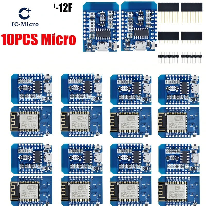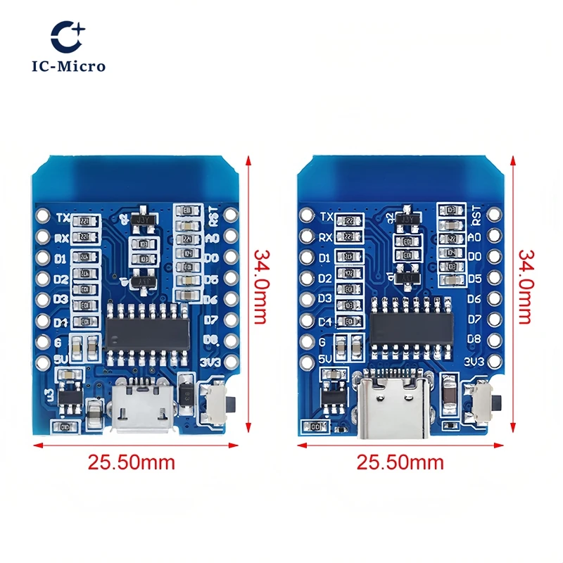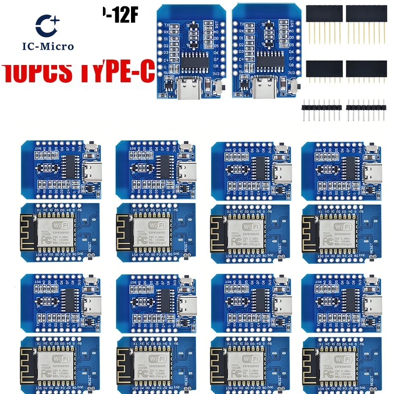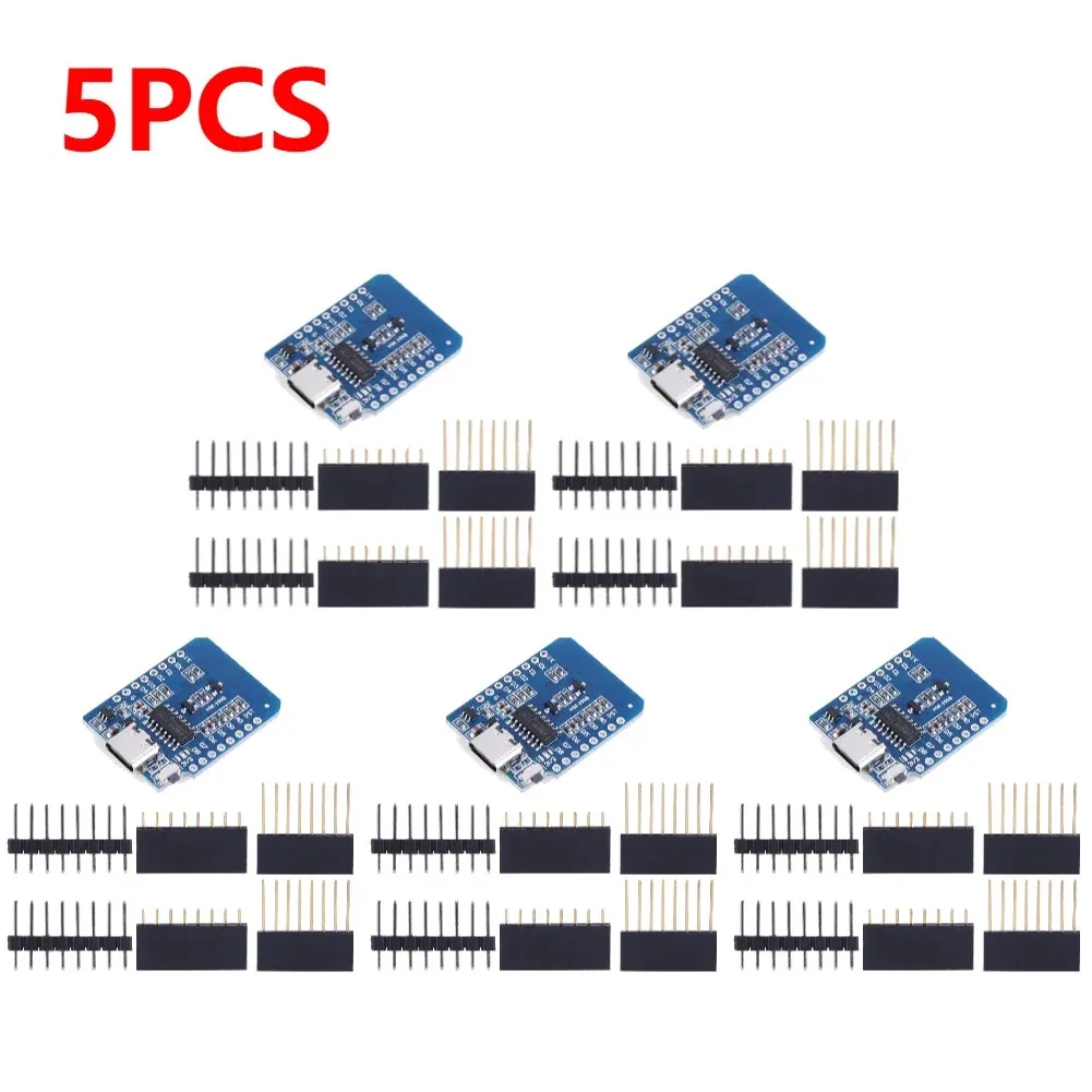 Imagine effortlessly bringing your IoT projects to life with this set of sleek, blue ESP8266 D1 Mini Wi-Fi development boards. Each compact module, featuring the powerful ESP-12F Wi-Fi chip, is designed for quick integration, with neatly arranged surface-mounted resistors, capacitors, and chips. The boards boast a minimalist rectangular shape with a matte finish, offering a modern and professional look. Equipped with clear silkscreen labels and accessible pins, they simplify connecting sensors, relays, and other devices. Available in configurations of 1, 2, 3, 5, or 10 pieces, with options supporting Type-C or Micro USB interfaces, these boards are perfect for creating reliable, high-performance IoT solutions right out of the box.