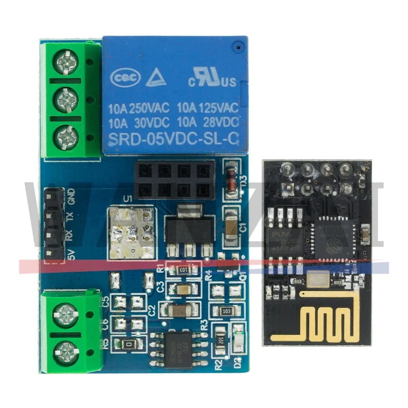 Experience seamless remote control with this compact, stylish ESP8266 WiFi relay module. Designed for effortless integration into smart home systems, it measures just 45mm by 28mm, making it easy to install in tight spaces. Its sleek black circuit board contrasted with vibrant green terminal blocks and a bold blue relay component creates a modern aesthetic. The WiFi module’s gold-patterned antenna traces add a subtle metallic touch, emphasizing its high-tech design. Perfect for DIY projects, automation, and IoT applications, this module allows you to remotely switch appliances, equipment, or lights with reliable, long-range wireless connectivity. Its robust construction ensures durability and consistent performance with a relay life cycle of 100,000 cycles, making it an excellent choice for residential or commercial automation solutions.