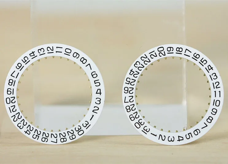 Enhance your watch repair skills with these two white date indicator discs compatible with ETA 2804-2 and 2824-2 movements. Featuring a clean, minimalist design with black numerals from 1 to 31 evenly spaced along the outer edge and subtle gold-colored tabs for secure fitting, these discs weigh approximately 5 grams combined. Ideal for watch enthusiasts and professionals, they are made from durable, non-chemical materials, ensuring reliable performance during accessory replacement or restoration projects. With model options H3 and H6, these replacement parts help you restore the functionality and aesthetic of your watch, ensuring precise date display in your ETA-powered timepieces.