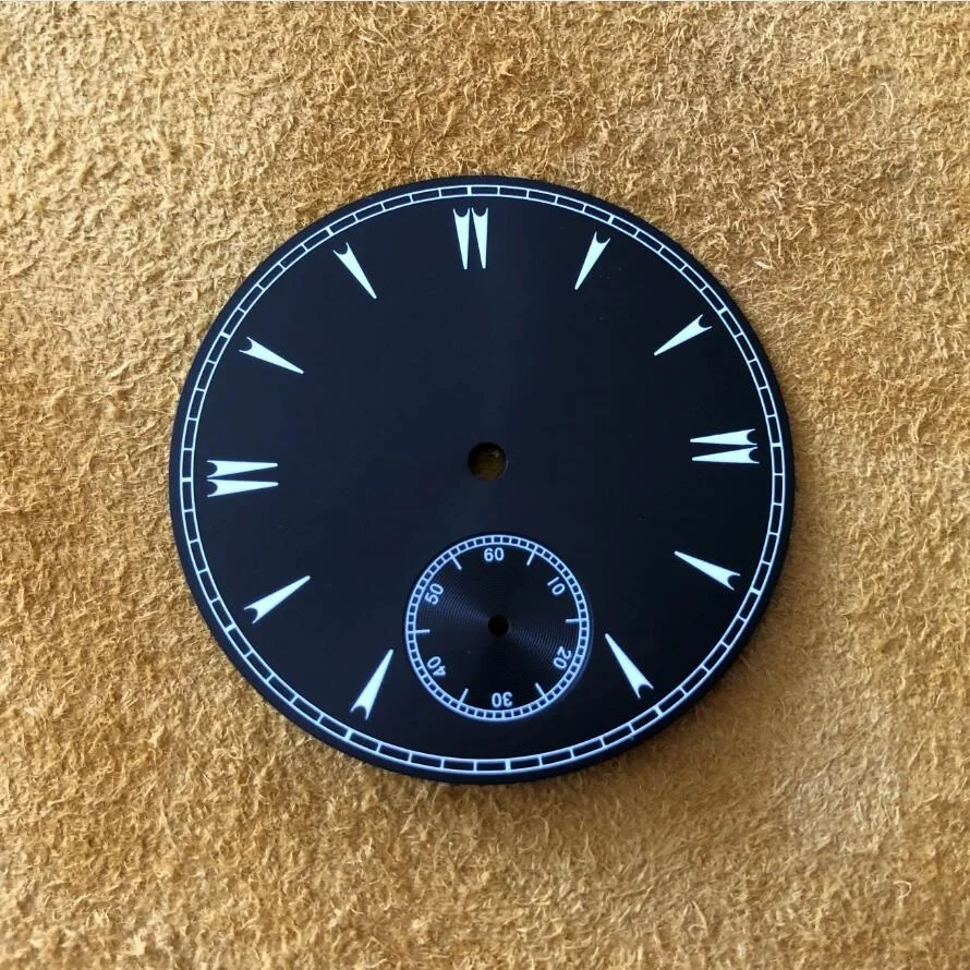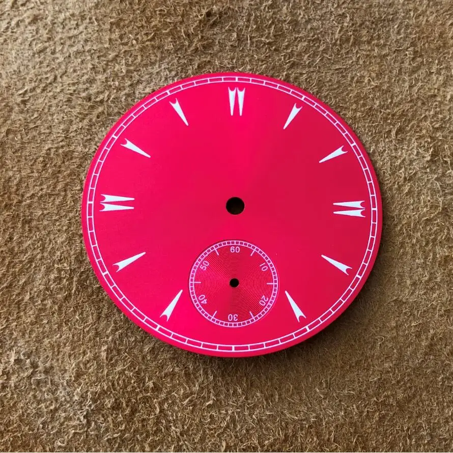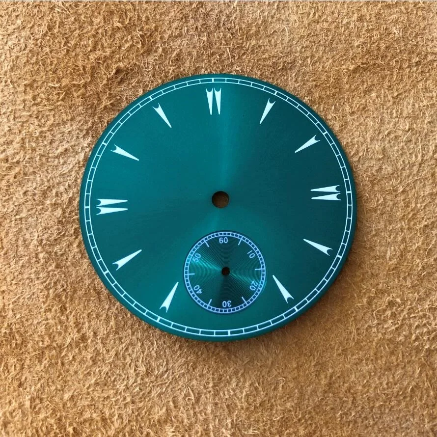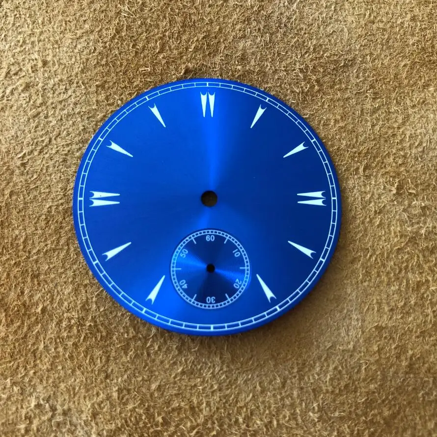This exquisite watch dial, specifically designed for ETA6498 and Seagull ST3621 manual mechanical movements, brings a touch of elegance and precision to your timepiece. Its vibrant blue color is not only striking but is also reflective, enhancing its visual charm. Crafted from durable copper, the dial features a diameter of 38.9mm and a thickness of just 0.4mm. Prominently displayed are tall, pointed white hour markers ensuring readability, while a sub-dial for seconds at the 6 o'clock position showcases clear numerical markings. Elevate your watch repair projects with this perfect blend of functionality and aesthetic appeal.