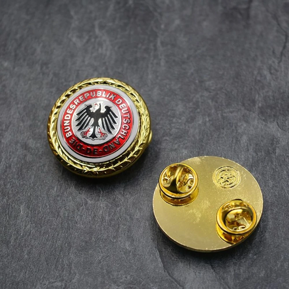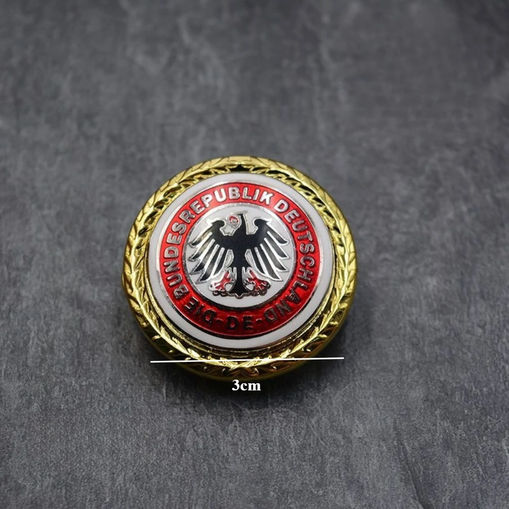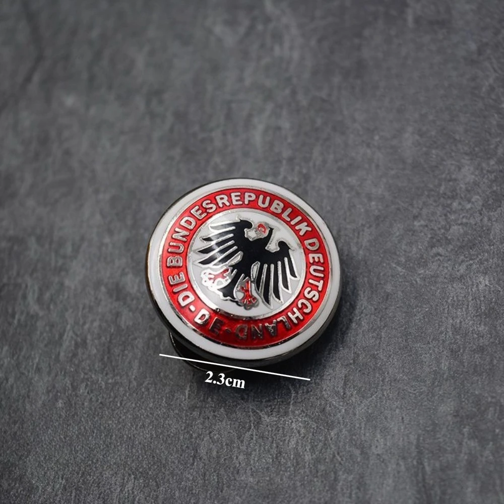 Imagine adding a touch of European elegance to your collection with this striking European Eagle Medal. Crafted from high-quality metal, it boasts a polished finish available in gold and silver, enhancing its vintage and nostalgic appeal. The medal features a bold black eagle with outstretched wings, clutching a scepter and orb, symbolizing strength and authority. Encased in a vibrant red enamel ring inscribed with “DIE BUNDESREPUBLIK DEUTSCHLAND,” it exudes official prestige. Surrounding the badge is a decorative, twisted rope-like gold border, adding an ornate touch. With a butterfly clasp, this medal is easy to attach to clothing or accessories for ceremonial, decorative, or craft projects, making it an excellent statement piece for collectors or enthusiasts.