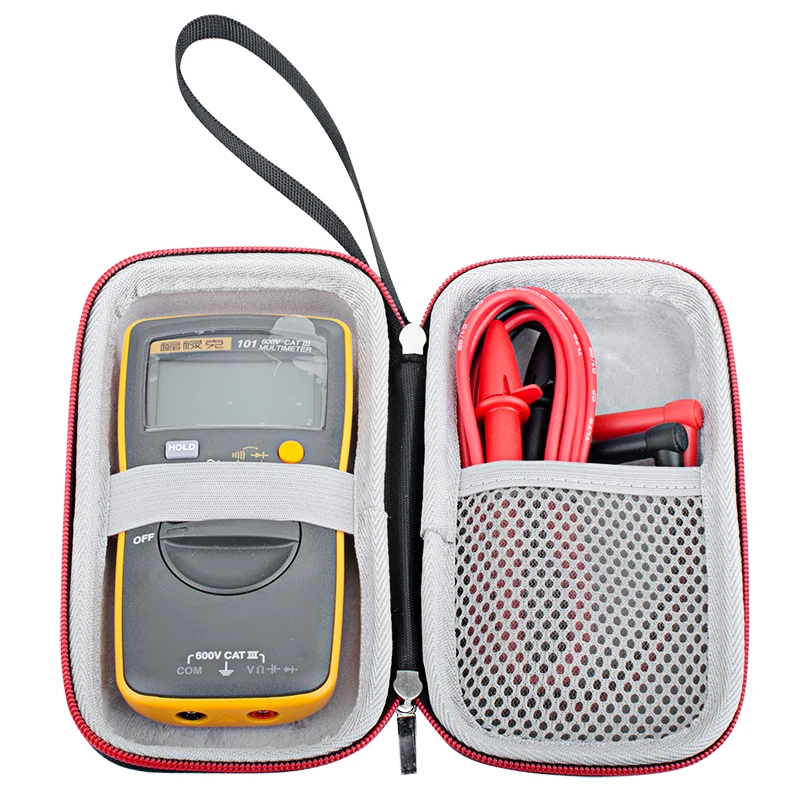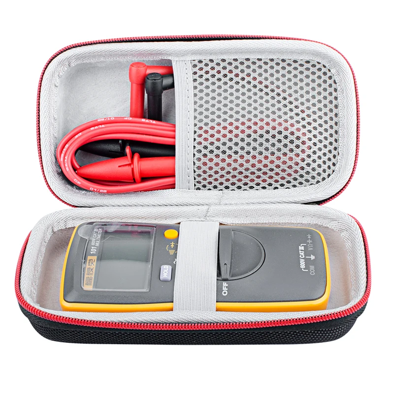 Protect your Fluke F101 Mini Digital Multimeter with this sleek, durable EVA travel case. Crafted from semi-water resistant, shockproof material, it offers excellent protection for your device during travel or storage. The case's minimalist black exterior features a smooth surface with contrasting red accents on the double zipper, ensuring ease of access. When opened, the plush velvet-lined interior cushions your multimeter and accessories, preventing scratches and absorbing shocks. The designated compartment keeps the multimeter secure, while the mesh pocket holds test leads, probes, or small accessories. This lightweight, portable case combines practicality, style, and protection, making it ideal for professionals or enthusiasts on the go who need a reliable, organized storage solution.