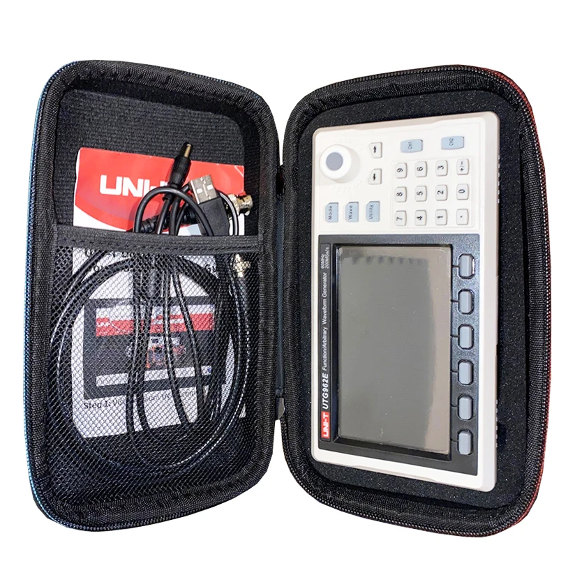 Designed for ultimate protection and portability, this black EVA hard travel case measures 230 x 140 x 75 mm and weighs just 200 grams, specifically fitting UNI-T UTG932, UTG962, UTG932E, and UTG962E function/arbitrary waveform generators. Crafted from durable, waterproof EVA material, it offers heavy-duty protection with anti-knock, shockproof features, ensuring your device stays safe during transport. The sleek, minimalist rectangular design is complemented by a contrasting yellow zipper pull, adding a subtle pop of color. The interior features custom foam padding for a snug fit, while the mesh pocket with elastic straps provides organized storage for accessories. Ideal for professional use and on-the-go convenience.