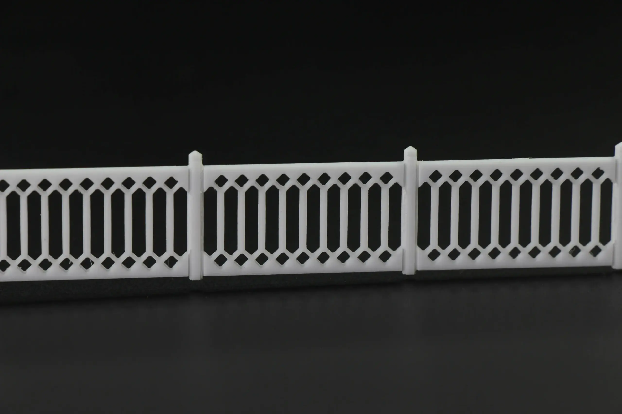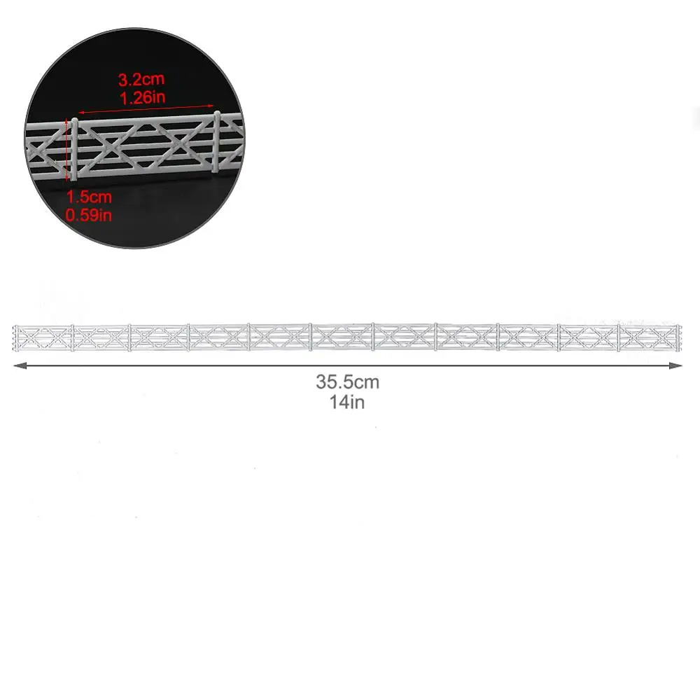 - This set of three white plastic fences measures a total of 1 meter, each segment approximately 35cm, ideal for creating detailed and realistic miniature rail or landscape scenes.