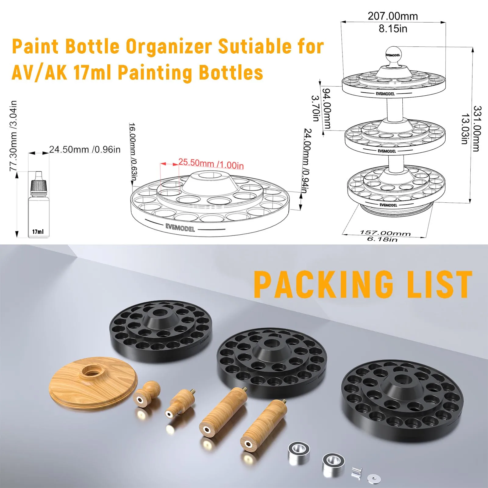 Imagine having all your vibrant pigment bottles neatly arranged on a stylish, space-efficient stand that you can easily access with just a flick of your wrist. This Evemodel rotatable paint organizer features a sleek, circular design with three stacked levels, each holding 27 colorful pigment bottles in perfectly aligned slots. Made from durable ABS plastic, warm wood accents, and subtle metallic details, it combines modern aesthetics with functional robustness. Its smooth, rotating base allows effortless access to your collection without clutter, perfect for saving space on your desk or workspace. Easy to assemble, this modular stand transforms chaos into order, letting your pigments shine while keeping everything within reach for your next masterpiece.