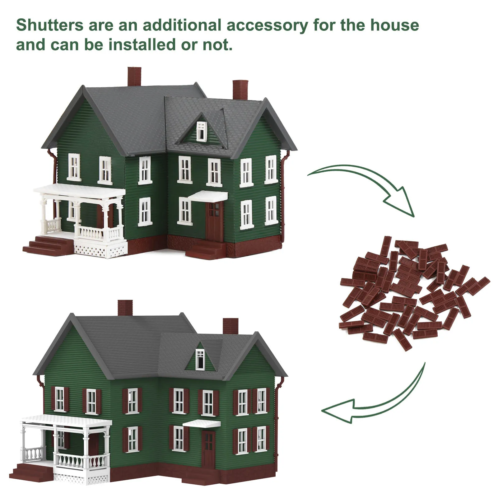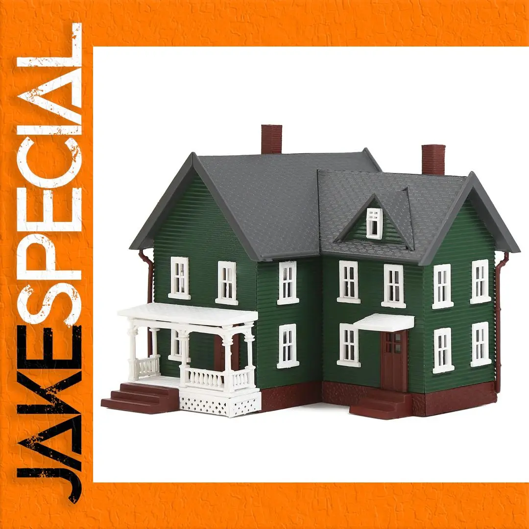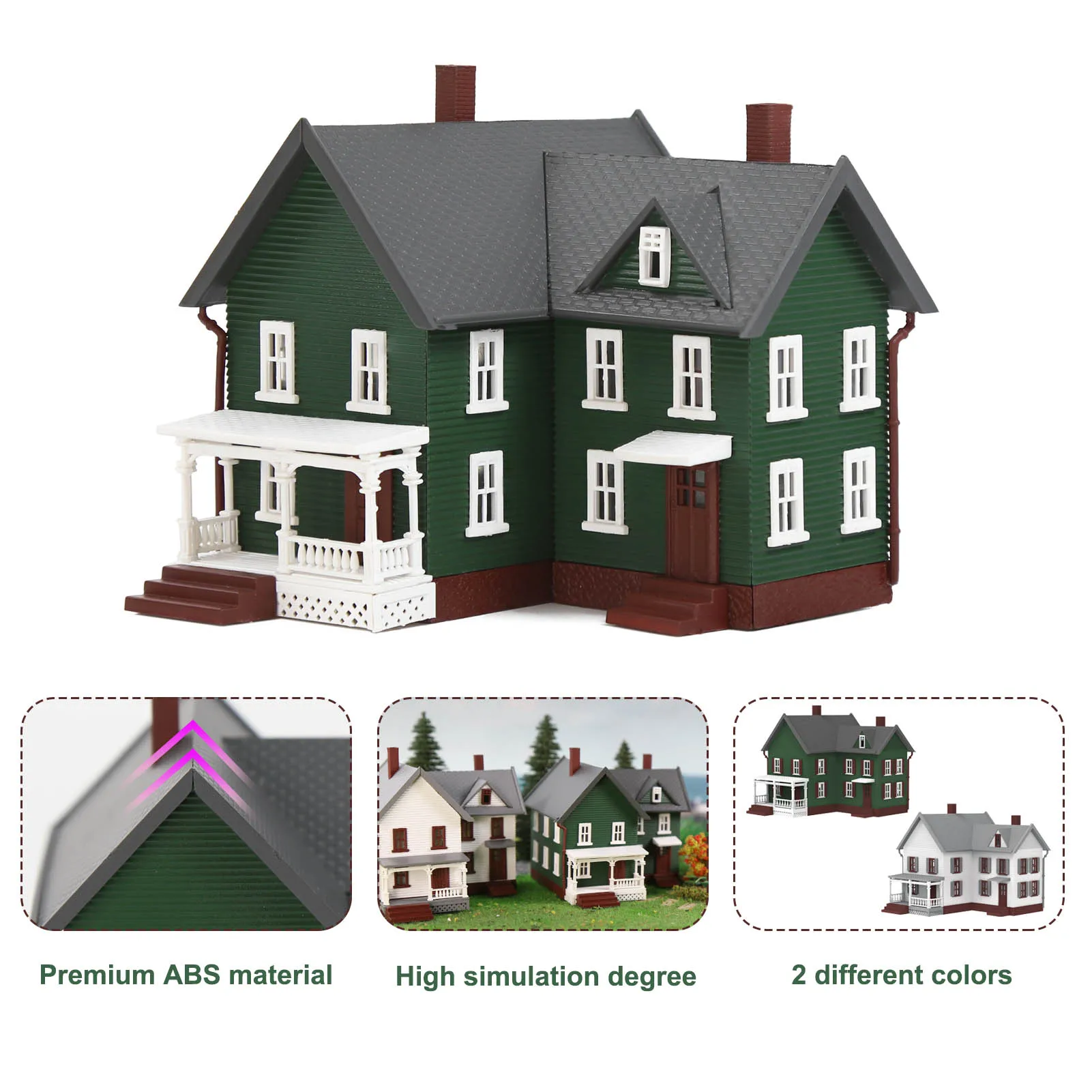 Bring your miniature world to life with this detailed Evemodel N scale (1:160) model house kit. Designed as a charming two-story dwelling with a welcoming porch, this high-quality plastic model features realistic textures and intricate details, including a deep forest green horizontal siding, white-framed windows with small panes, textured grey shingles on the sloped roof, brick-colored chimneys, a brown front door with a windowpane, and a cozy porch with white railing and latticework supported by columns. Perfect for adult collectors and hobbyists, model JZN5885P offers an authentic vintage aesthetic that will enhance any model landscape or diorama.