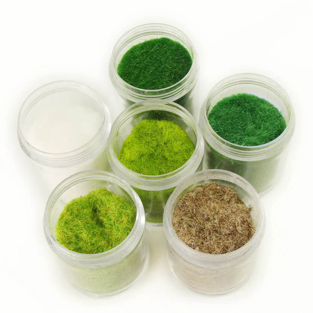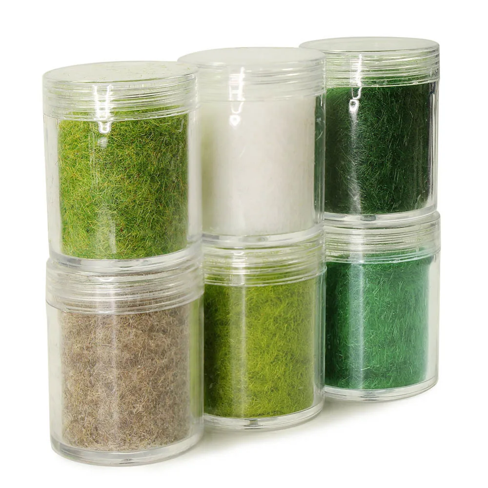 Imagine bringing your miniature landscapes to life with this stunning range of static grass powders. Designed for hobbyists and modelers, this product offers vibrant, finely textured fibers approximately 3mm long. The six rich colors—bright green, light green, dry yellow-brown, dark green, yellow-green, and white—are perfect for creating realistic natural terrains and scenic landscapes. Packaged in clear plastic bags, each color’s fibrous texture is easily visible, allowing for precise application and seamless blending. Whether you're building a detailed model railway, war game battlefield, or diorama, this static grass set will elevate your work with its natural look and consistent quality. Enhance your projects with realistic terrain effects that truly stand out.