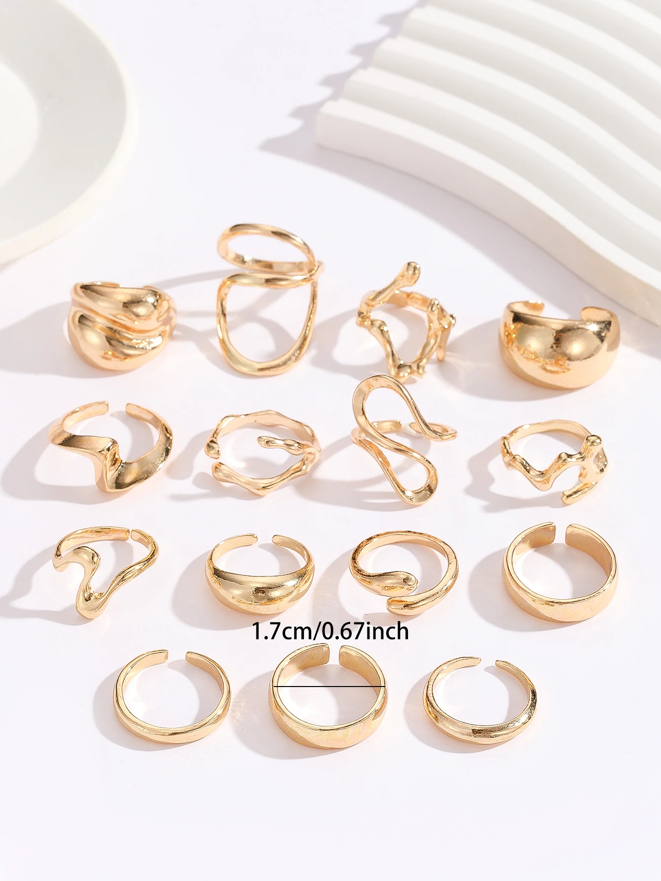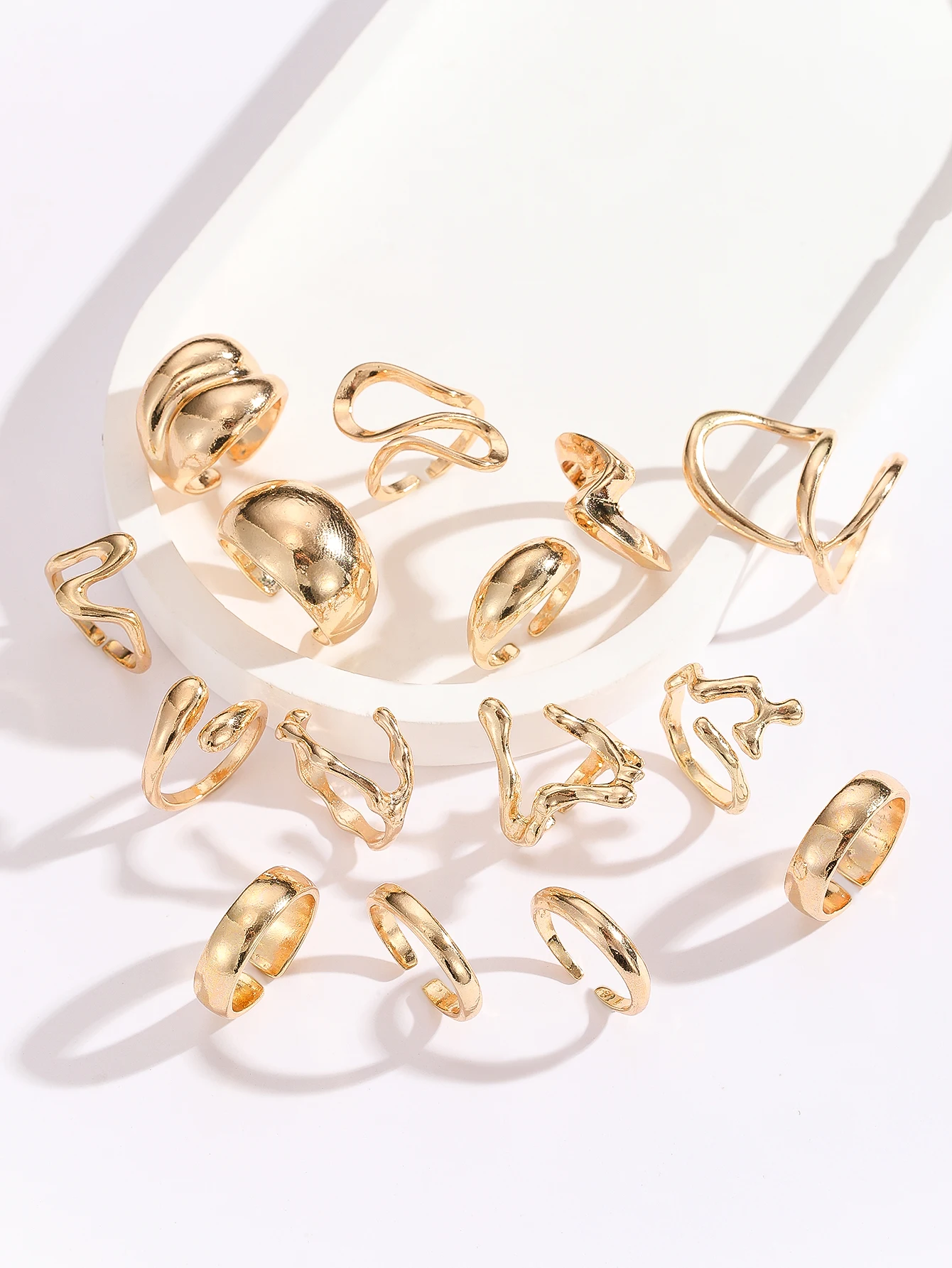 - This set includes 15 high-quality, exaggerated smooth irregular lava line rings crafted from zinc alloy with 18k gold plating, perfect for goth enthusiasts seeking bold, artistic accessories.