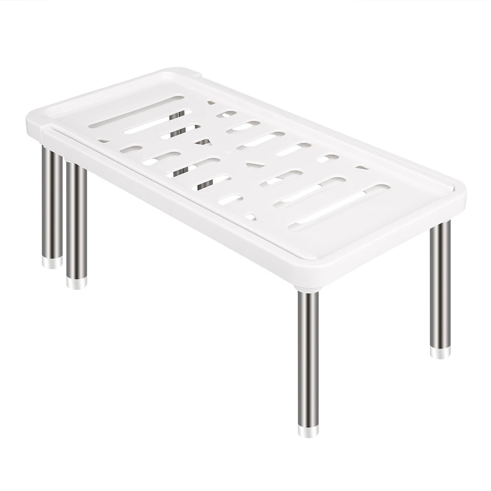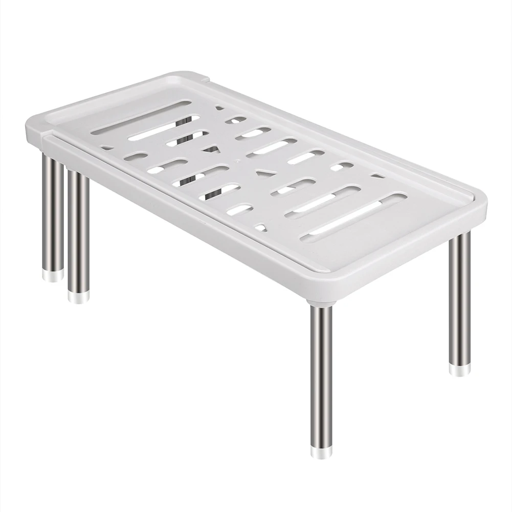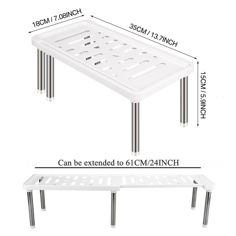 Transform your kitchen storage with this sleek, this modern expandable cupboard shelf. Designed to optimize space effortlessly, it features a minimalist white or gray platform with elongated slits and small round drainage holes, seamlessly blending style with function. Supported by polished stainless steel legs with non-slip pads, it ensures stability and a contemporary look. Its adjustable length from 36 to 69 cm allows you to customize the fit within kitchen cabinets from 35 to 61 cm wide. The sturdy support structure and retractable mechanism help maximize vertical space, making it ideal for storing various kitchen essentials. Easy to set up and versatile, this shelf keeps your cabinets tidy and your space organized in a modern, stylish way.
