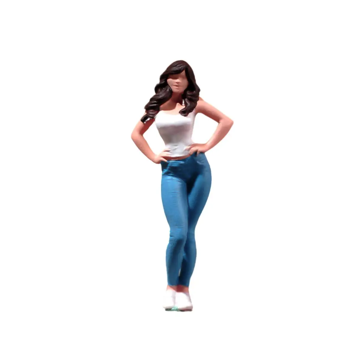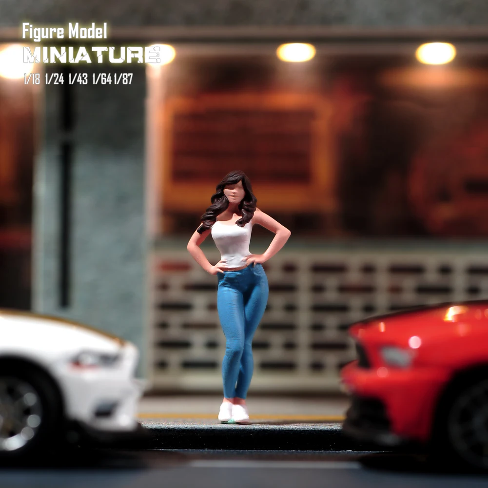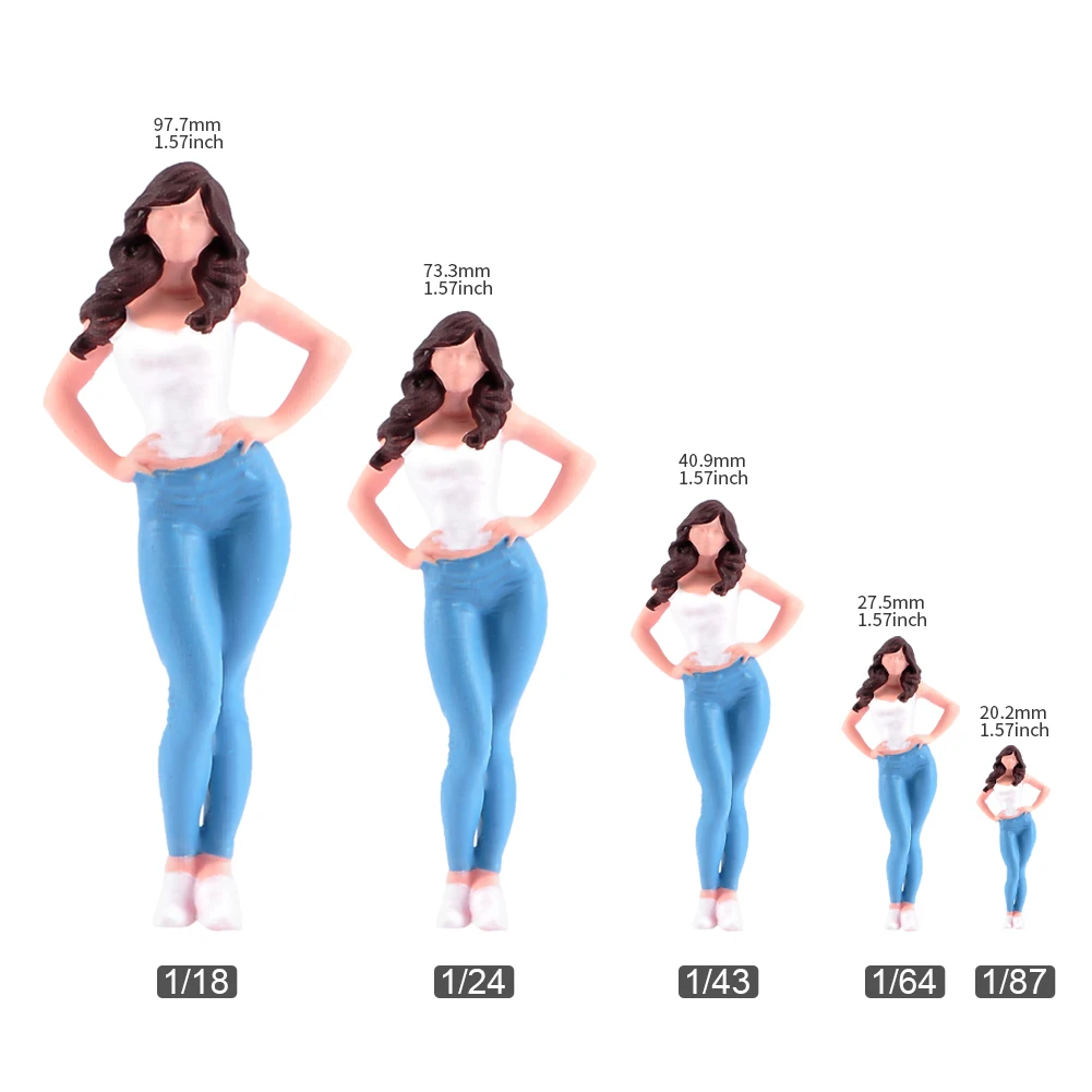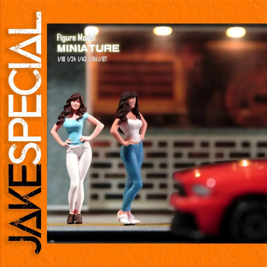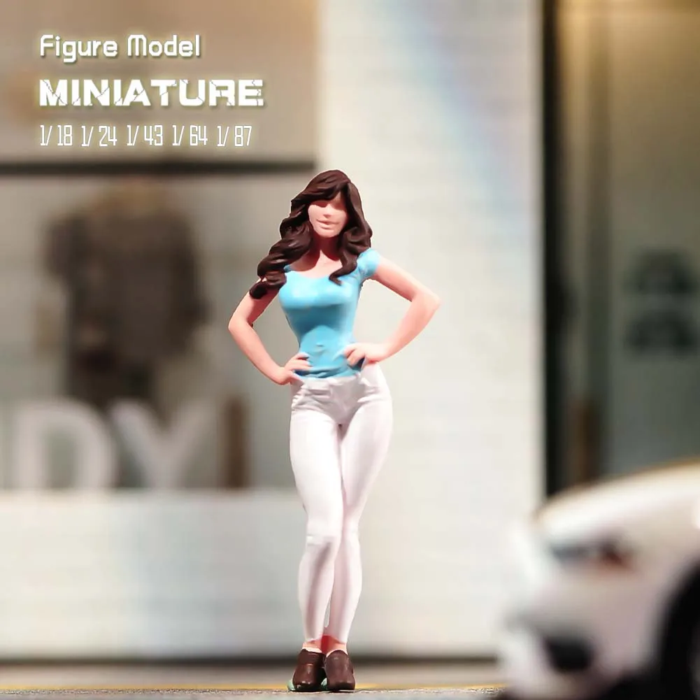 Both enchanting figures showcase exquisite craftsmanship, perfect for collectors and enthusiasts. Made from high-quality, eco-friendly resin, the dolls measure in scales of 1/87, 1/64, 1/43, 1/24, and 1/18. Each figure showcases unique styles, with one in a light blue top and white pants and the other in a matching white top with light blue jeans. Their long, dark brown hair is carefully detailed, framed by confident poses that make them captivating display pieces. Designed for aesthetics, these miniatures provide an ideal opportunity for decoration, viewing, and even micro photography, enhancing your collection with their vibrant colors and intricate features.