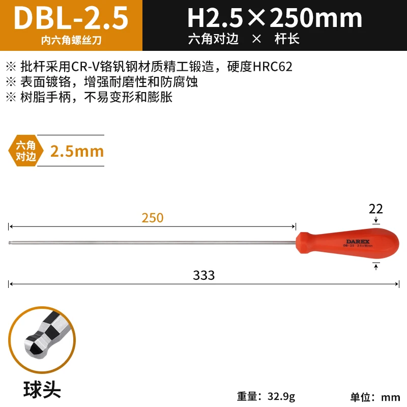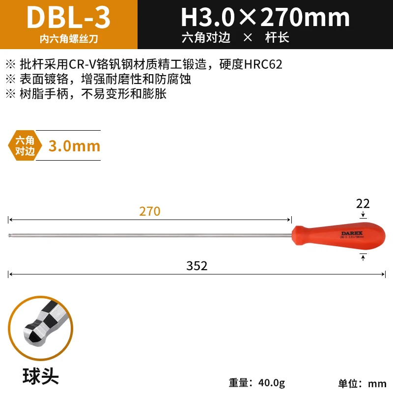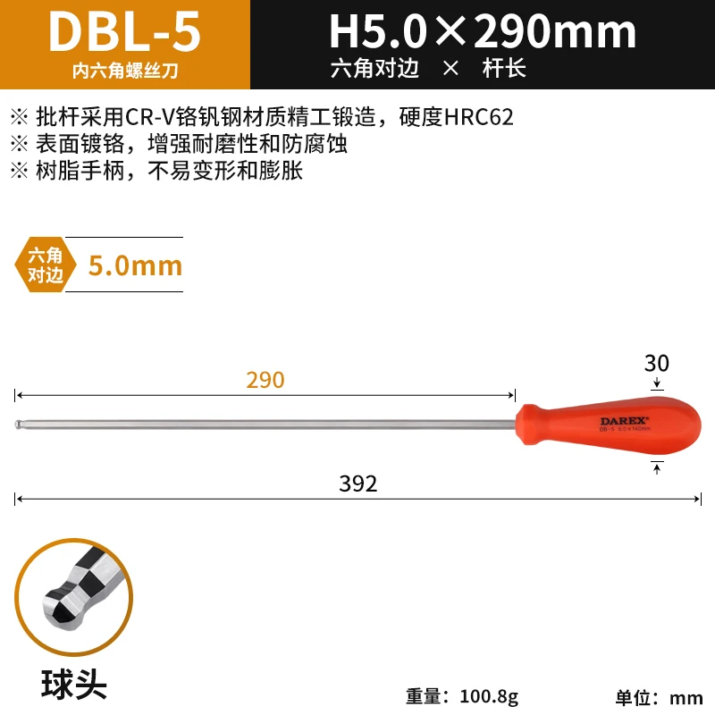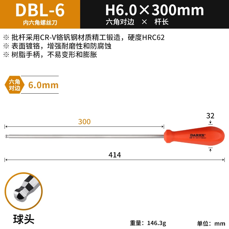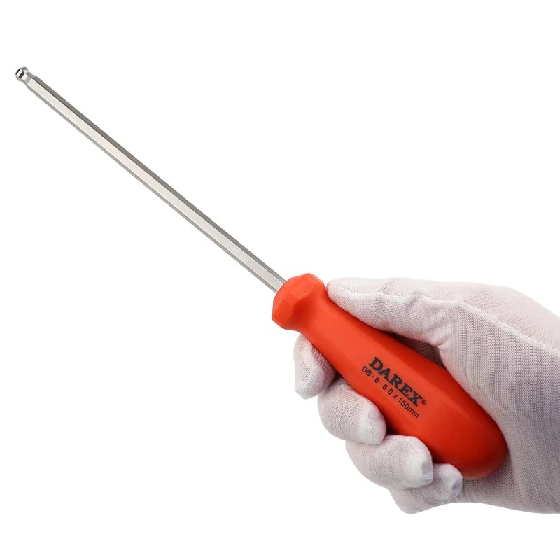 Experience the perfect blend of durability, ergonomics, and technical excellence with this DAREX extended hexagonal screwdriver. Crafted from high-quality Chromium Vanadium Steel with a hardness of HRC62, these screwdrivers are built to withstand tough professional and hobbyist tasks. The chrome plating ensures exceptional wear and corrosion resistance, maintaining a sleek, shiny finish over time. The vibrant resin handles are ergonomically designed for maximum comfort, featuring a tapered, bulbous shape that fits naturally in your hand. Each handle is printed with the bold black “DAREX” logo, adding to its professional aesthetic. The ball end tips allow for angled screw access, making every job easier and more efficient. This set provides versatile sizes, perfectly suited to various hex screw-driving needs.