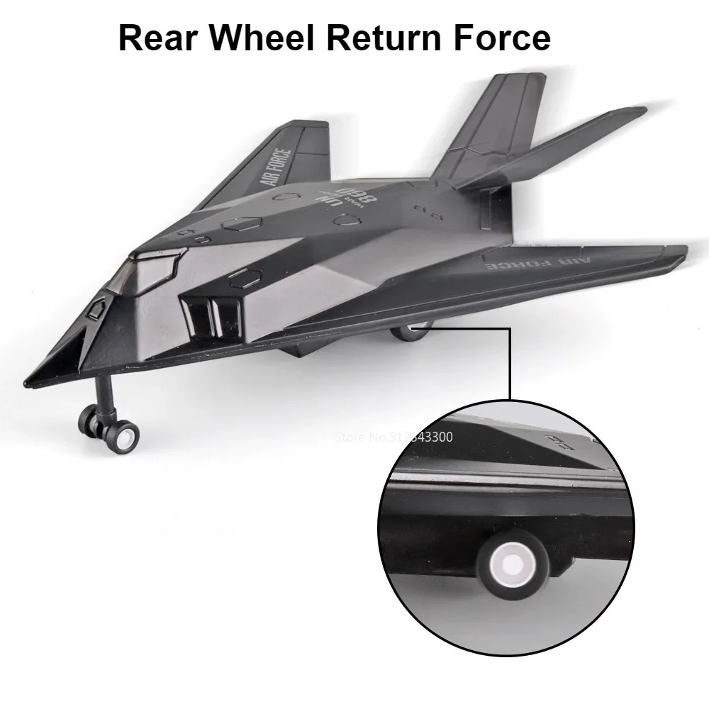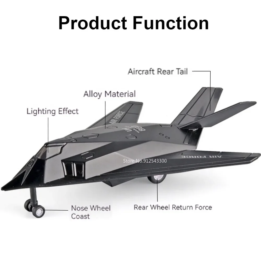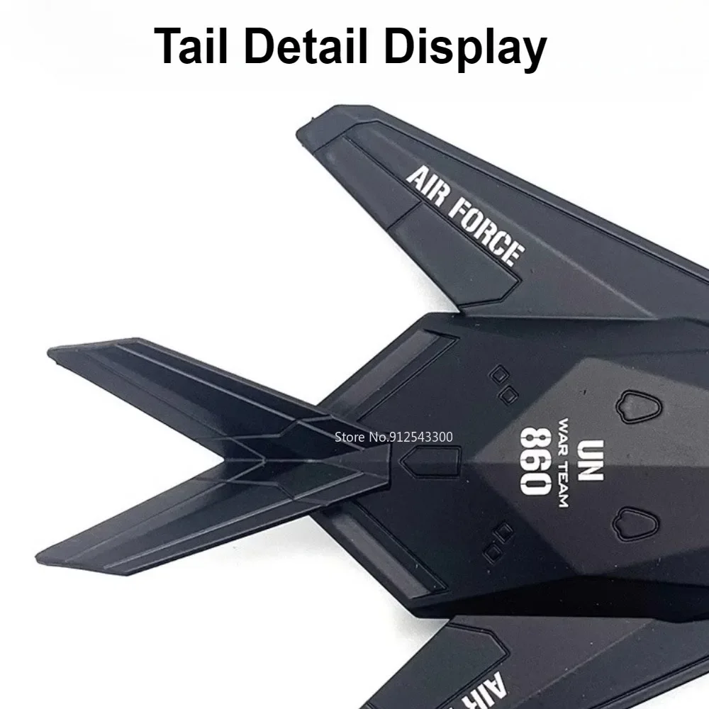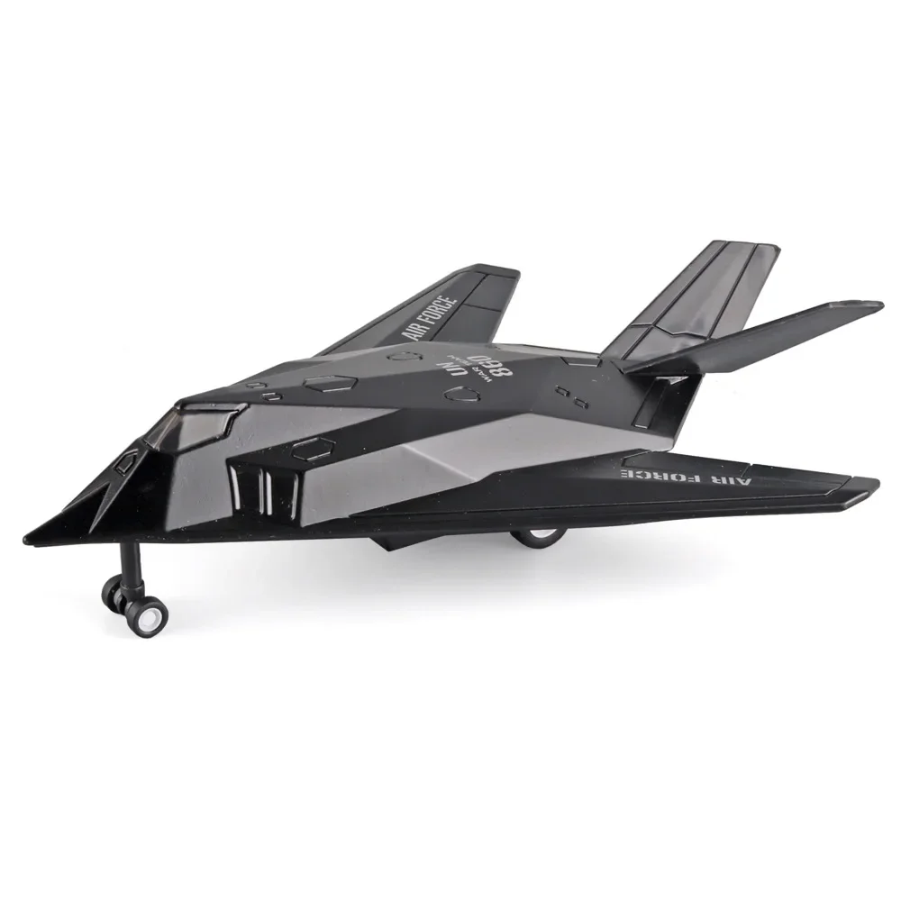 Experience the thrill of owning a highly detailed replica of the iconic F-117A Nighthawk fighter jet with this 1:100 scale model. Crafted with a durable metal alloy body and a plastic chassis, it boasts a sleek black finish accentuated by precise surface details, including hexagonal panel lines and angular design. Its compact size of approximately 20 x 13.7 x 4.7 centimeters makes it an impressive display piece that combines realism with playability. This high-simulation aircraft features functional sound and light effects, enhancing its military aesthetic. The pull-back mechanism allows for dynamic movement, making it an engaging option for collectors and enthusiasts alike. Its sturdy construction ensures longevity and an authentic look that captures the stealthy allure of the original jet.