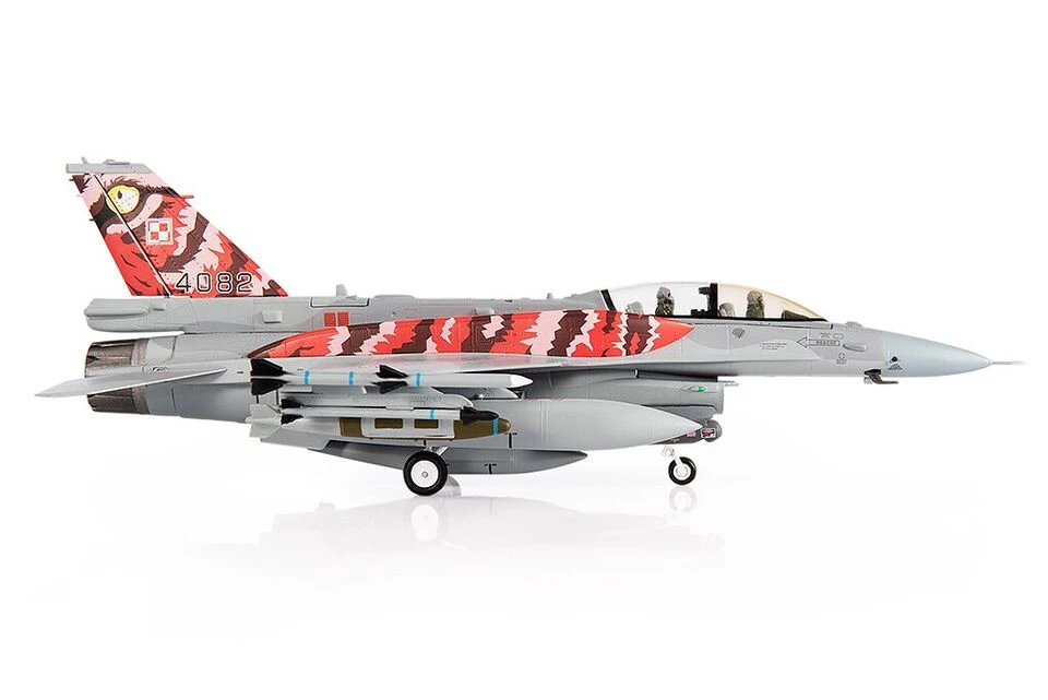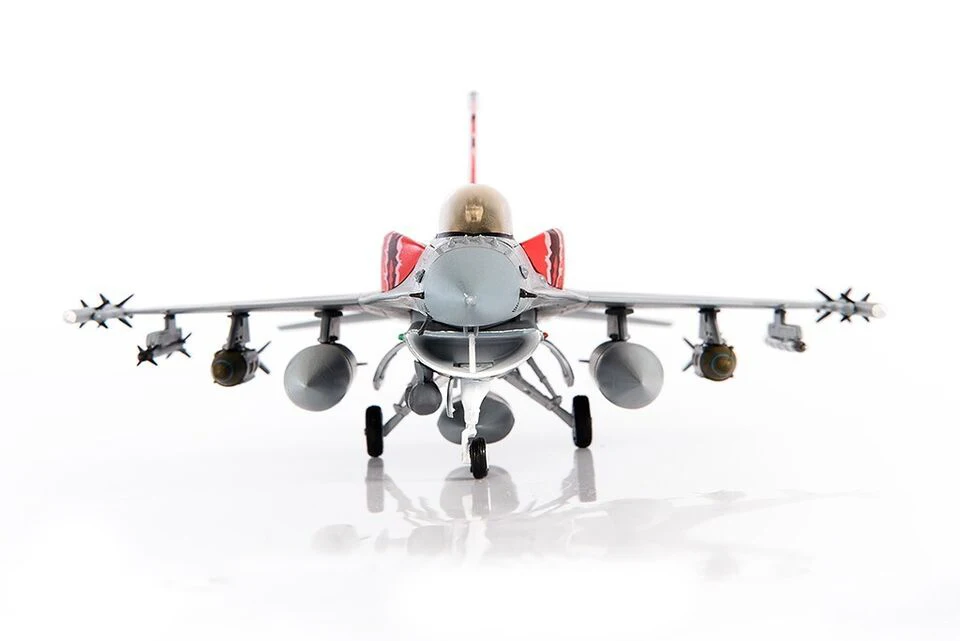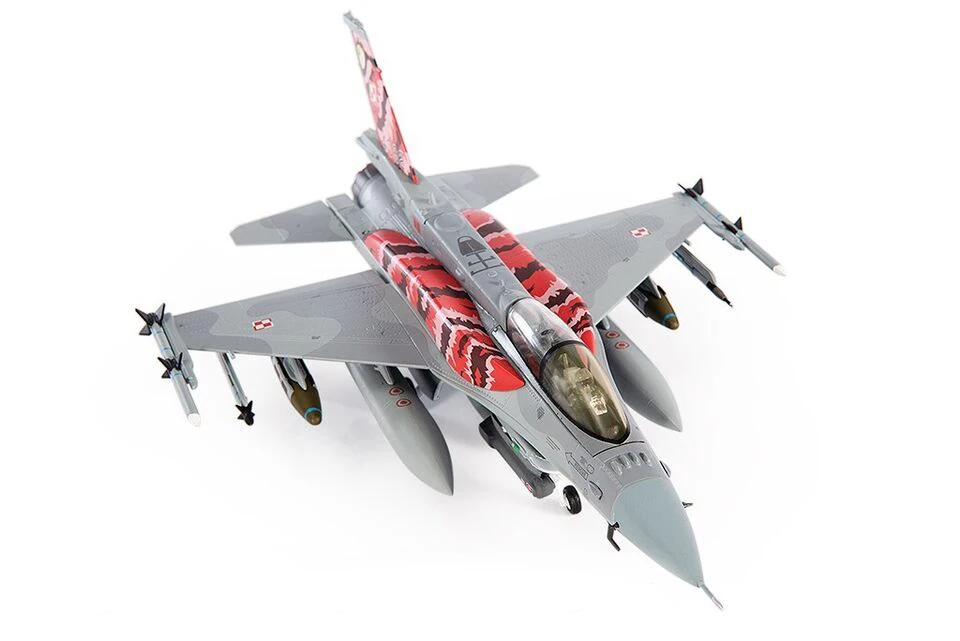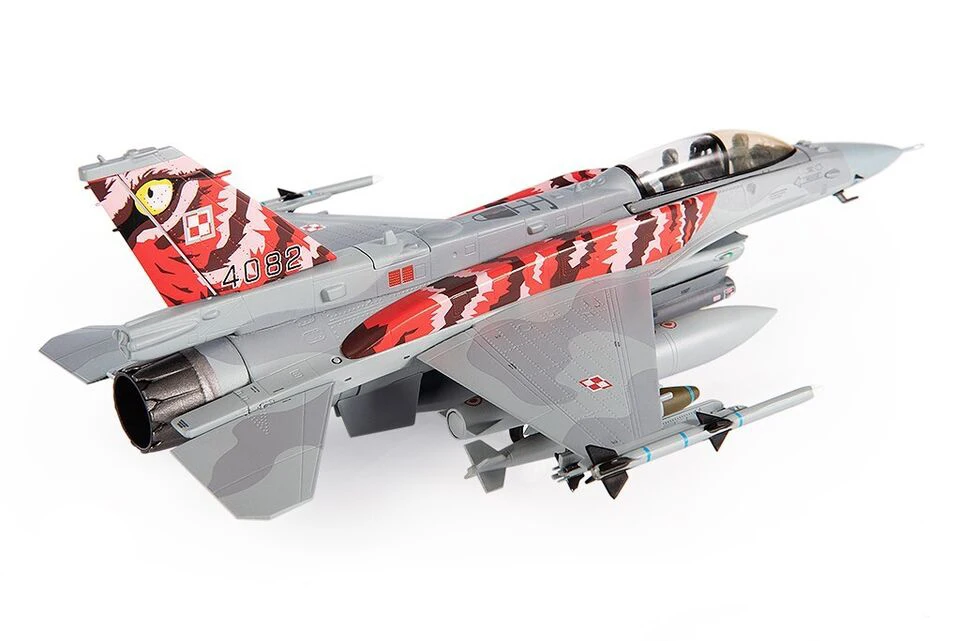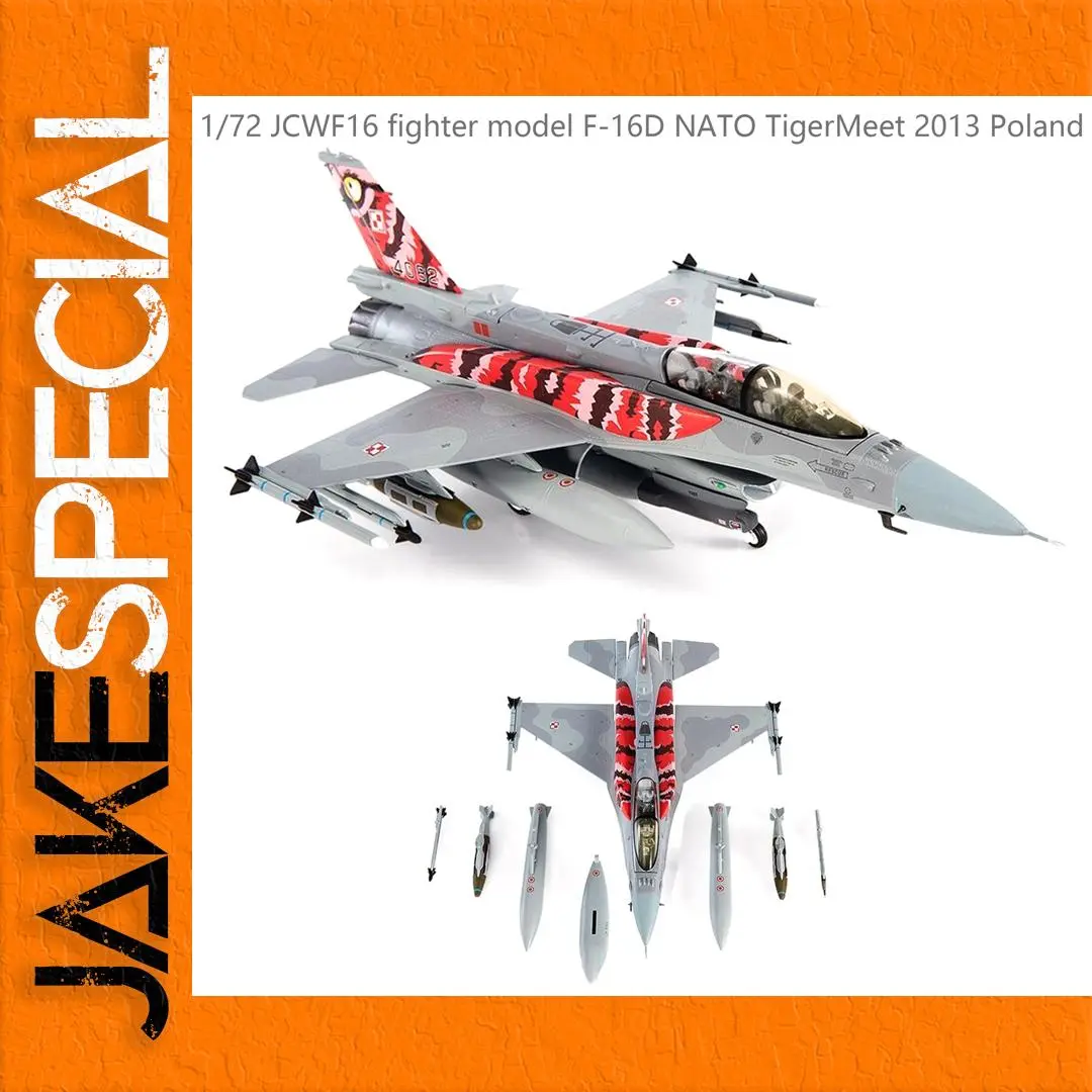 The 1/72 JCWF16 fighter model F-16D commemorates the NATO Tiger Meet 2013 event, showcasing a sleek design with a light gray finish, vivid red tiger stripes, and black accents. Measuring approximately 20.4 cm in length and 13.4 cm in wingspan, this diecast model is crafted from high-quality zinc alloy, ensuring durability and a realistic metallic appearance. Featuring intricate cockpit details visible through a clear canopy, it also includes Polish Air Force insignias and multiple underbody hardpoints for armament. A must-have for collectors, this model perfectly captures the essence of the F-16D from the 6th FS at Poznan Krzesiny AB, Poland.