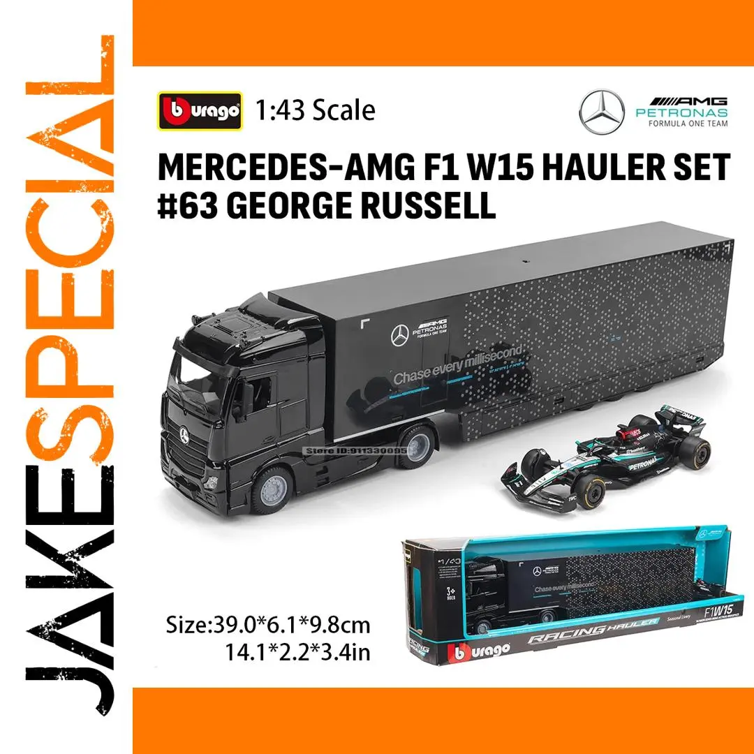 Discover this expertly crafted die-cast metal model set at a 1:43 scale, featuring the sleek black Mercedes-AMG F1 W15 Hauler with #63 George Russell and the vibrant Ferrari SF24 with #16. The detailed design highlights include realistic windows, side mirrors, and wheel wells, with the hauler showcasing the Mercedes-AMG Petronas logo and dynamic dotted pattern. Accompanied by a high-performance race car in striking team colors—black, teal, and white—this set captures the essence of modern Formula One racing. Carefully finished with fine craftsmanship, this collectible is suitable for enthusiasts aged 4 and above, with no batteries or electronics, and CE certified for quality and safety.