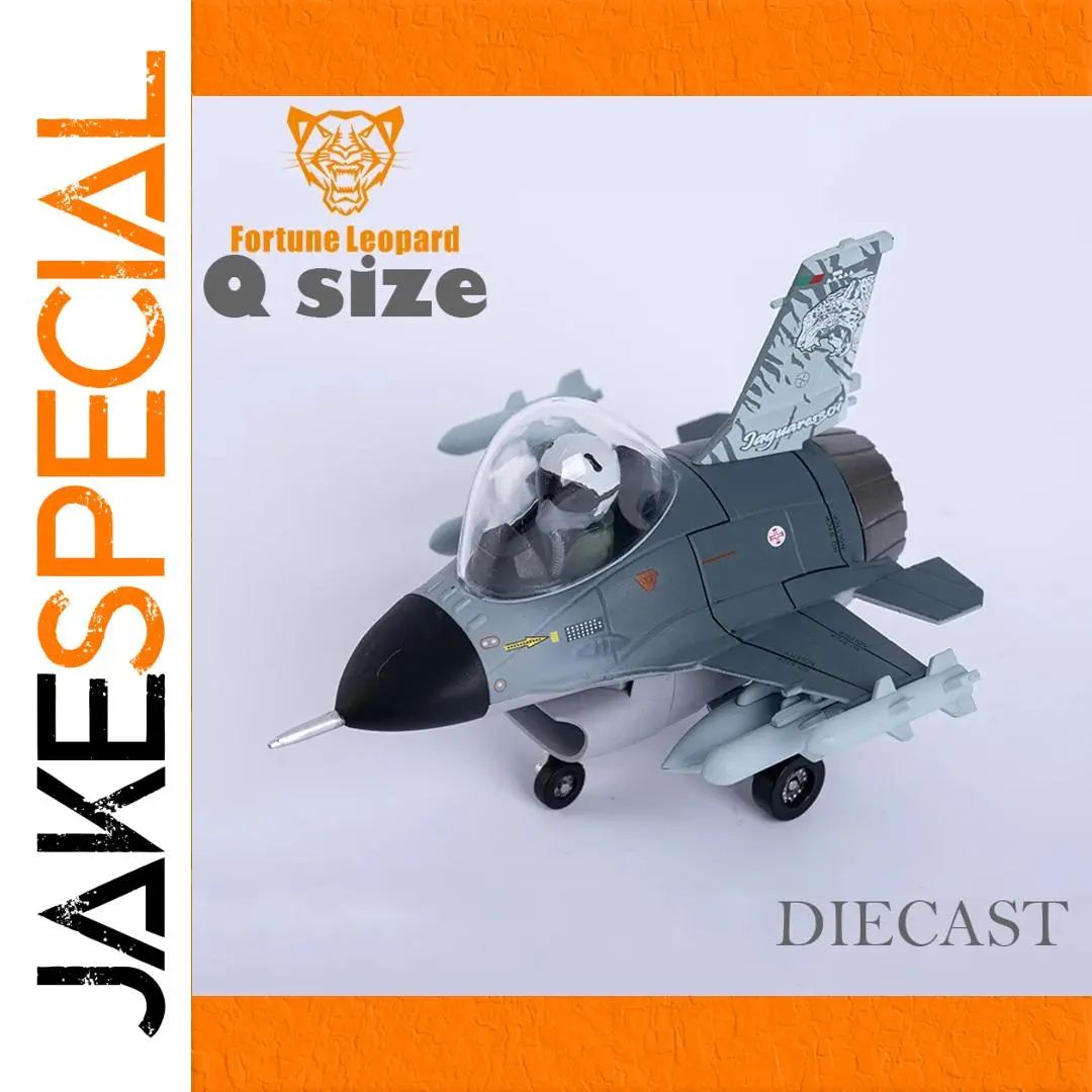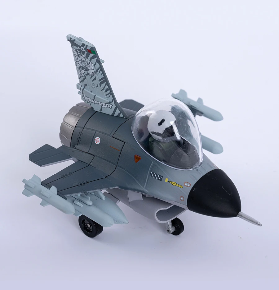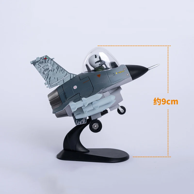 Experience the thrill of aviation with this meticulously crafted diecast model of the F16 fighter aircraft, model number QF16001. Measuring approximately 9 cm in length and 8.5 cm in width, this eye-catching piece features a sleek gray color with darker accents on the nose and tail. Constructed from durable diecast metal and plastic, it showcases a clear cockpit with a detailed pilot figure in a black helmet. The model includes finely detailed panel lines, markings, and a striking tiger graphic on the tail. With small missiles mounted under the wings and functional rolling wheels, this model is perfect for collectors and aviation enthusiasts alike.