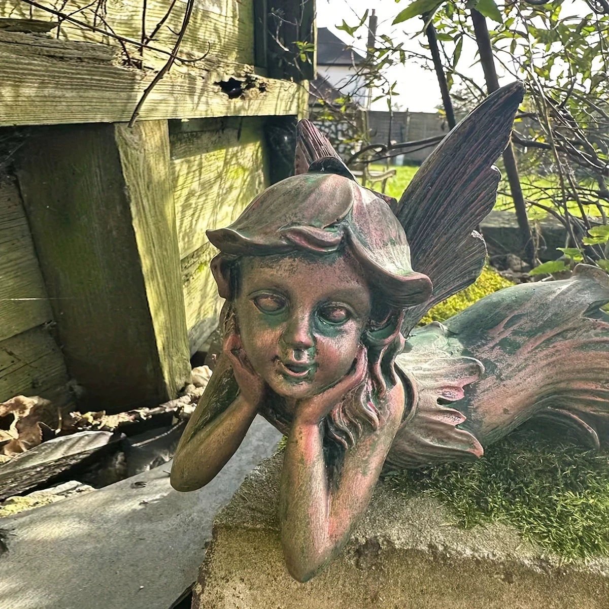 Transform your garden or indoor space with this enchanting fairy garden sculpture made of weather-resistant resin. Measuring 17.5 cm (6.88″) in length and 9.8 cm (3.85″) in width, it features intricate details including vivid wings with delicate veining, finely sculpted clothing, and a serene, dreamy expression. Finished in a subtle ‘A’ color with an elegant vintage, bronze-like hue, this figurine exudes timeless charm and artistic craftsmanship. Designed for both indoor and outdoor use, it resists sunlight, rain, and freezing temperatures, ensuring lasting beauty and adding a touch of fantasy and serenity to any decorative setting.