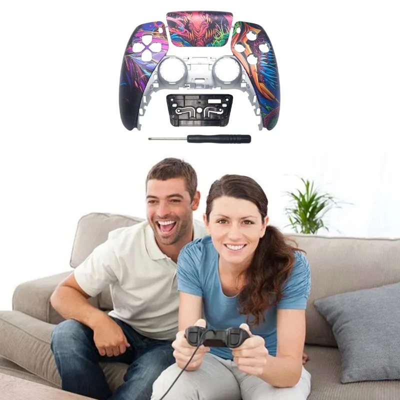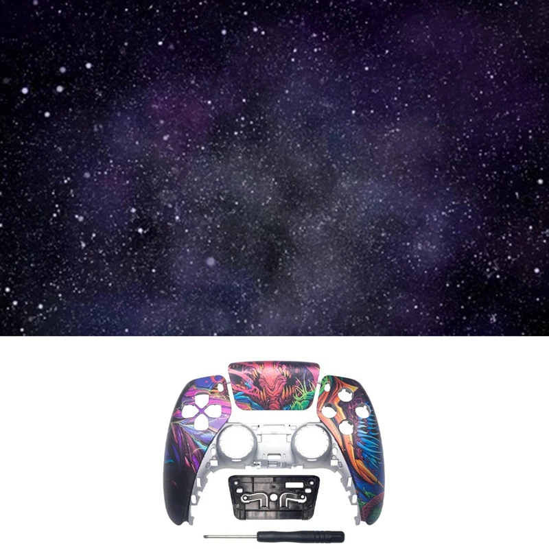 Transform your gaming experience with this stunning replacement front cover for the PS5 Elite gamepad, model BDM-010. Featuring an intricate, fantasy-inspired design, this shell boasts swirling patterns and mythical creature motifs in iridescent shades of purple, blue, orange, and green set against a dark background. Crafted from durable ABS with a smooth, glossy finish, it not only enhances visual appeal but also offers lasting quality. Perfect for gamers seeking a personalized look, this cover replaces the original top shell, giving your controller a bold, artistic makeover. Once installed, it provides a seamless, high-quality aesthetic, making your gaming sessions even more immersive and visually striking.