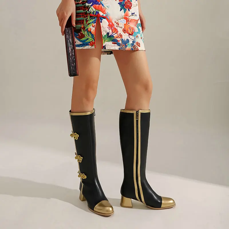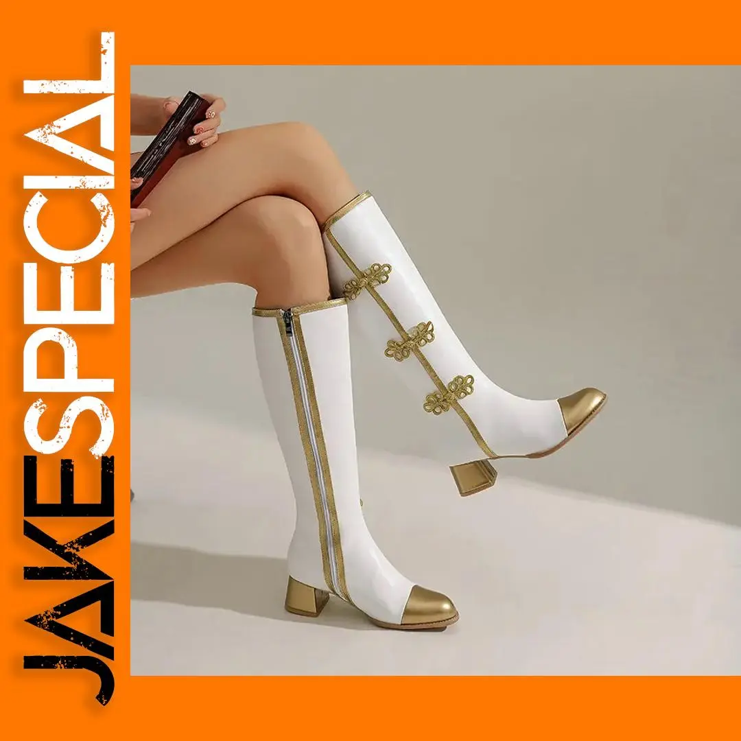 Step into the latest fashion trend with this pair of big size women's knee-high boots, perfect for autumn and winter. Whether you're heading to work or a casual outing, these boots offer comfort and style. The striking butterfly-knot design, combined with a square heel and platform, makes them stand out effortlessly. Crafted with high-quality PU material, they provide durability and a fashionable appearance. The zip closure ensures a secure fit, and the round toe offers comfort for all-day wear. Available in versatile black, white, and gold, these boots match various outfits, enabling you to express your unique style confidently. Imagine yourself stepping out with confidence, showcasing these trendy boots that complement your wardrobe beautifully. Experience the perfect blend of elegance and convenience today.